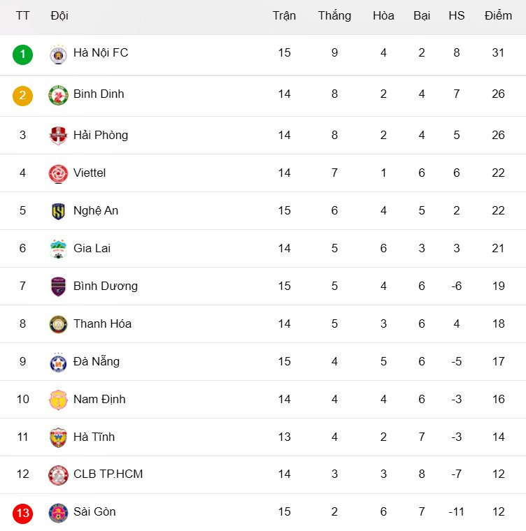| STT | Đội | Trận | T | H | B | HS | Điểm | |