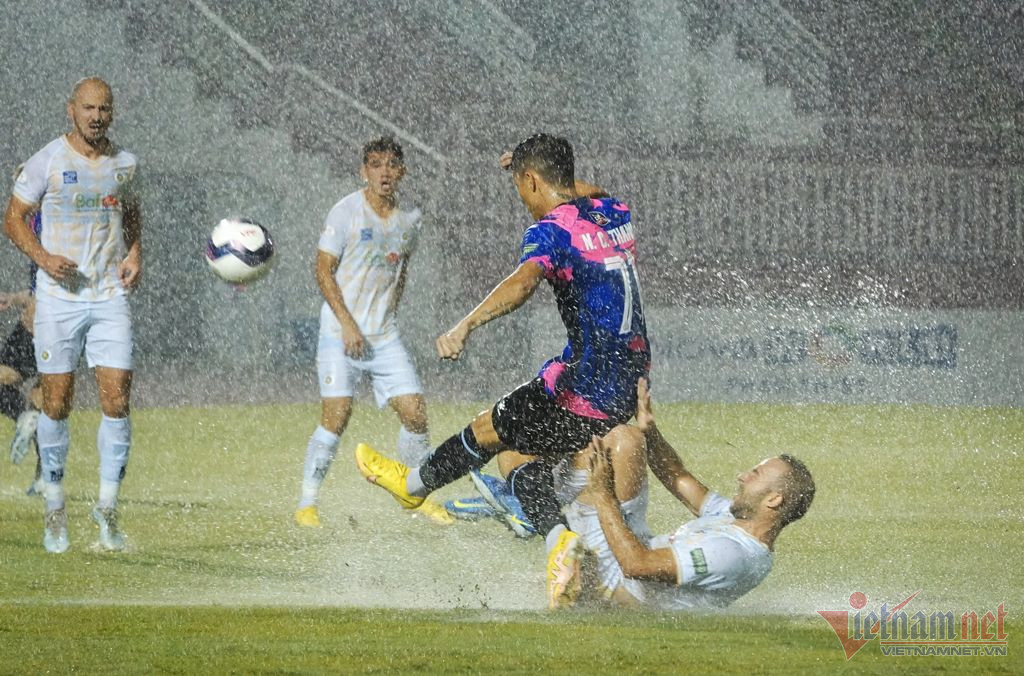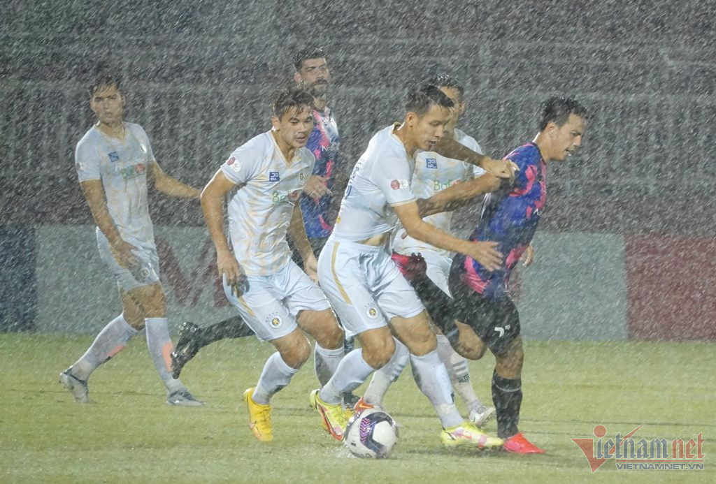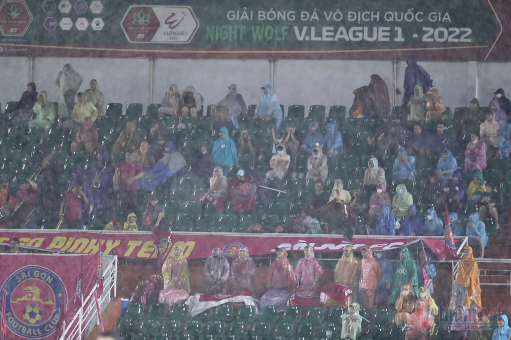 Cơn mưa nặng hạt trút xuống sân Thống Nhất ảnh hưởng đáng kể đến trận đấu.