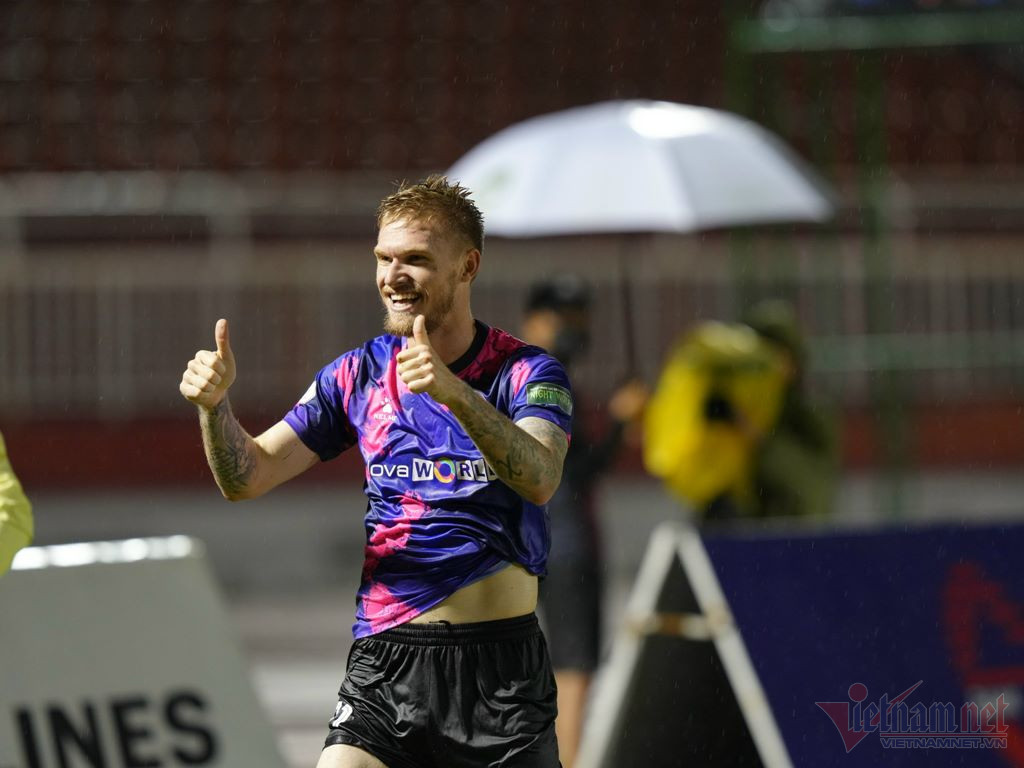 Từ tình huống treo bóng bên cánh trái, Matheus tranh chấp bóng bổng mở ra cơ hội rất ngon ăn để Olsen tung cú sút chéo góc. Tuấn Hải trong nỗ lực lao về phòng ngự phá bóng ra khi đã lăn qua vạch vôi. Sau đó Thành Chung vô tình phá bóng về lưới nhà.
