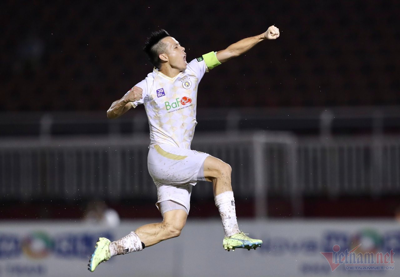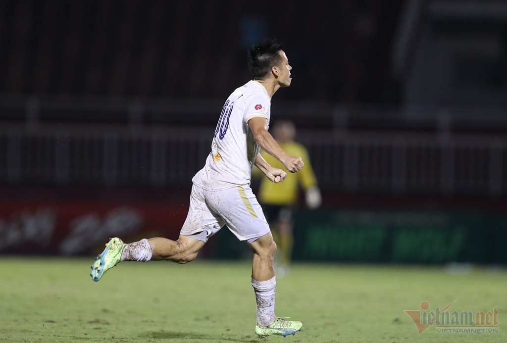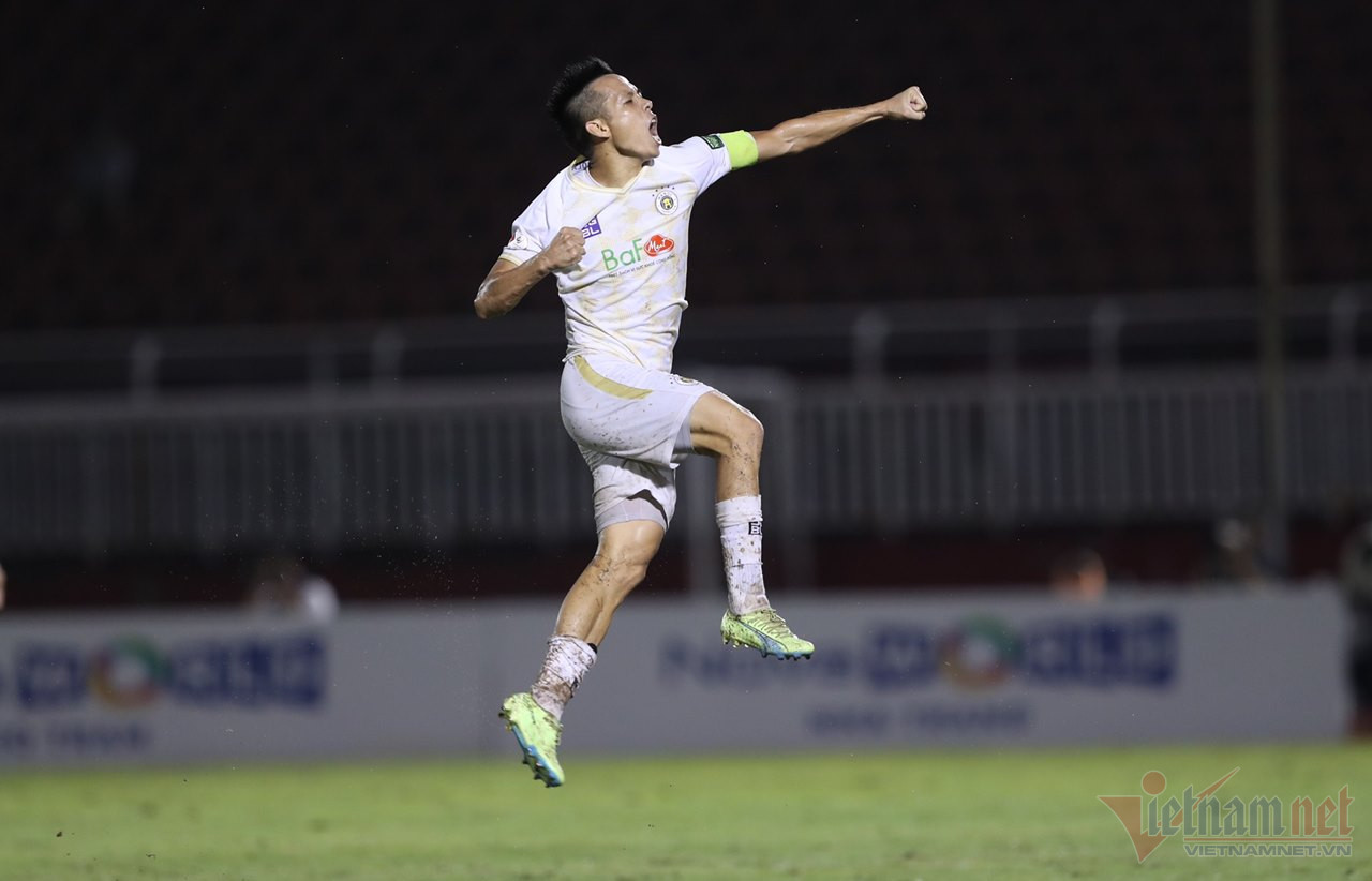Đội trưởng Văn Quyết dứt điểm liên tiếp trong vòng cấm Sài Gòn để mang về bàn quân bình tỷ số 1-1 cho Hà Nội.