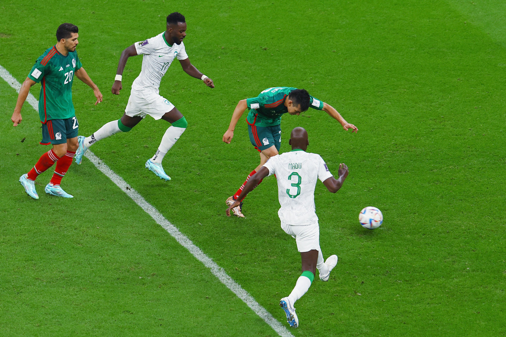 Nguy hiểm! Cơ hội rất tốt để Mexico ghi bàn thứ 3 trôi qua. Lozano thoát xuống sát biên ngang rồi chuyển ngược về loại Al Owais, Chavez dứt điểm trước khung thành trống bị Al Amri cản phá.