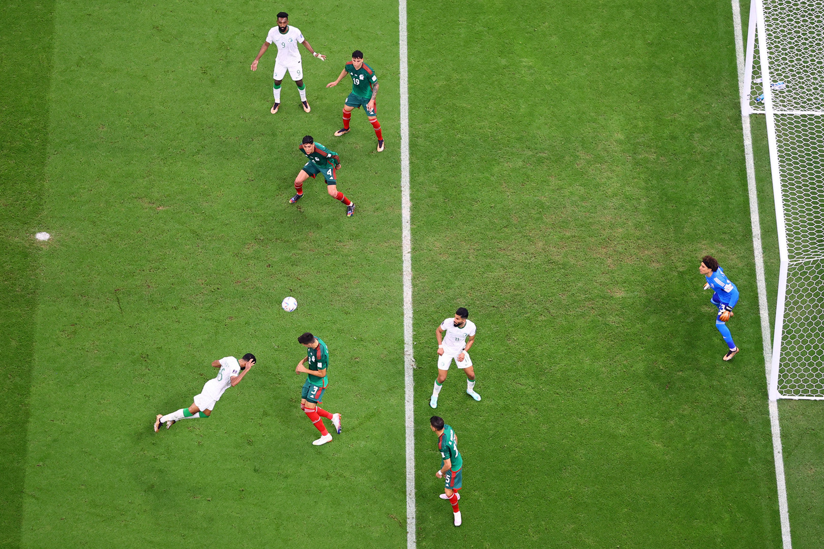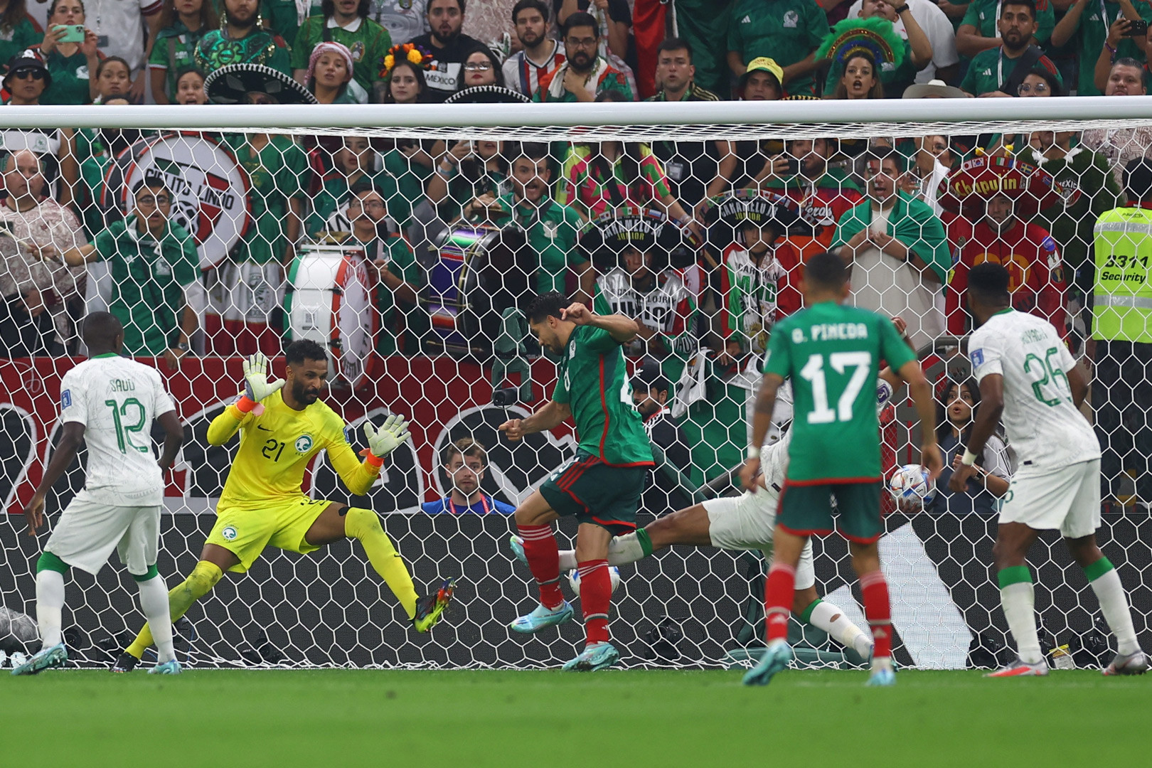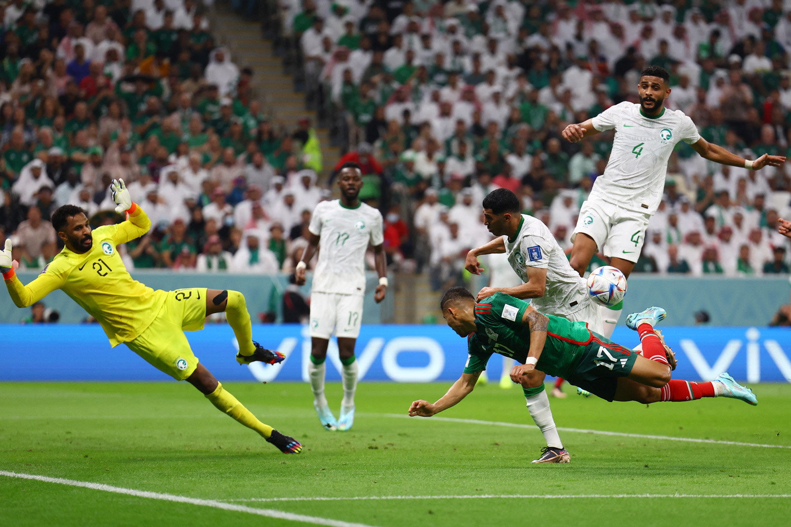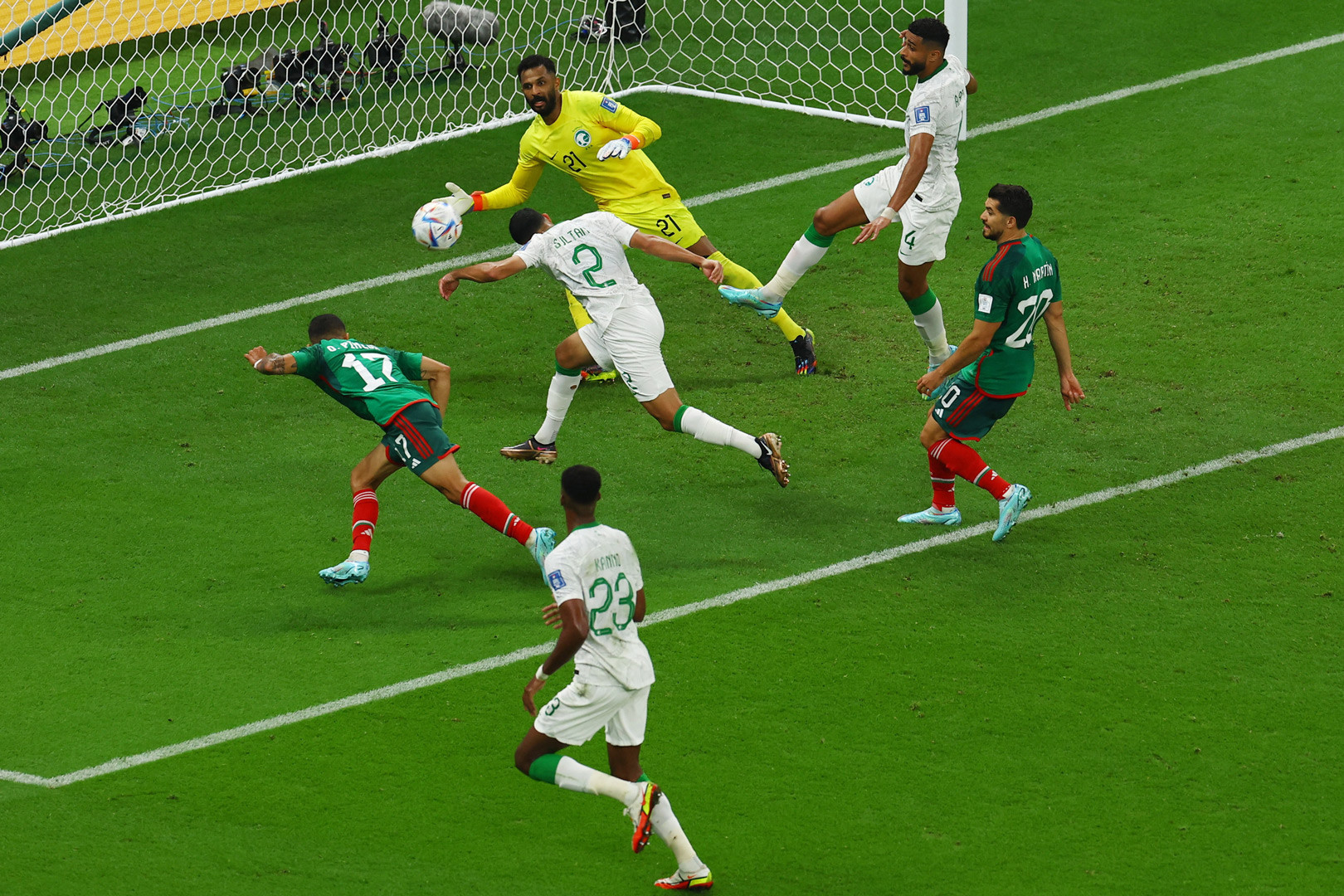 Al Owais phải băng khỏi vòng cấm đánh đầu phá bóng khi hai cầu thủ Mexico đang lao xuống rất nhanh. Saudi Arabia không thể chống đỡ trước áp lực của đối phương.