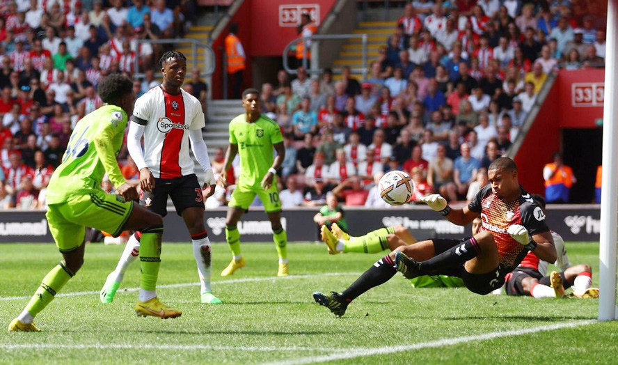 Khung thành Southampton chao đảo với 4 tình huống dứt điểm liên tiếp của Bruno, Elanga và Eriksen. May cho chủ nhà là thủ thành Bazunu cùng hậu vệ đã thi đấu lăn xả cứu thua.