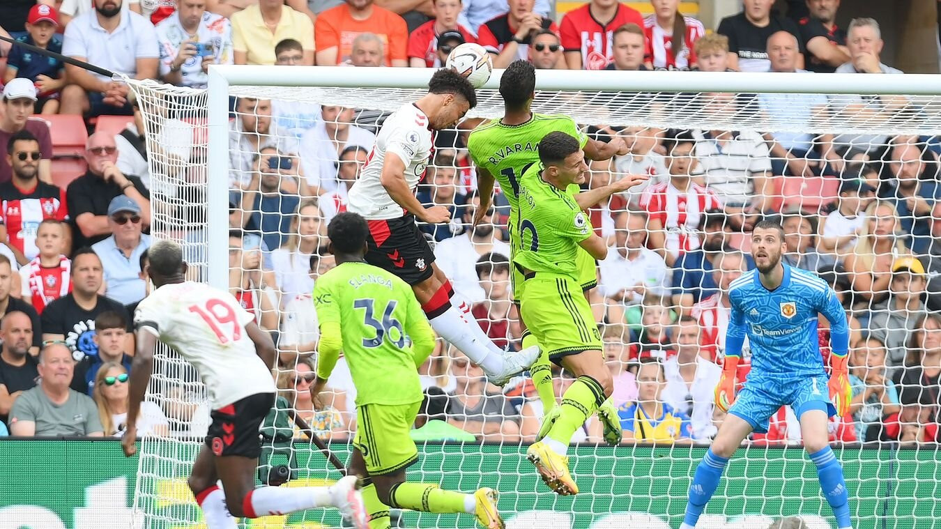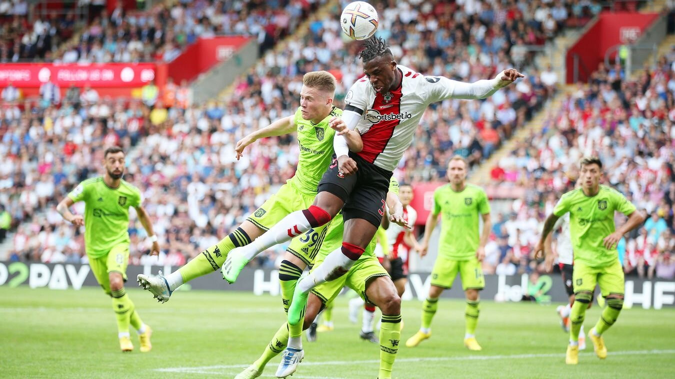 Southampton đang chủ yếu áp dụng các bài đánh biên rồi tạt vào trong, nhắm vào vị trí Lisandro Martinez bất lợi thể hình. Che Adams vừa có pha đánh đầu qua xà.