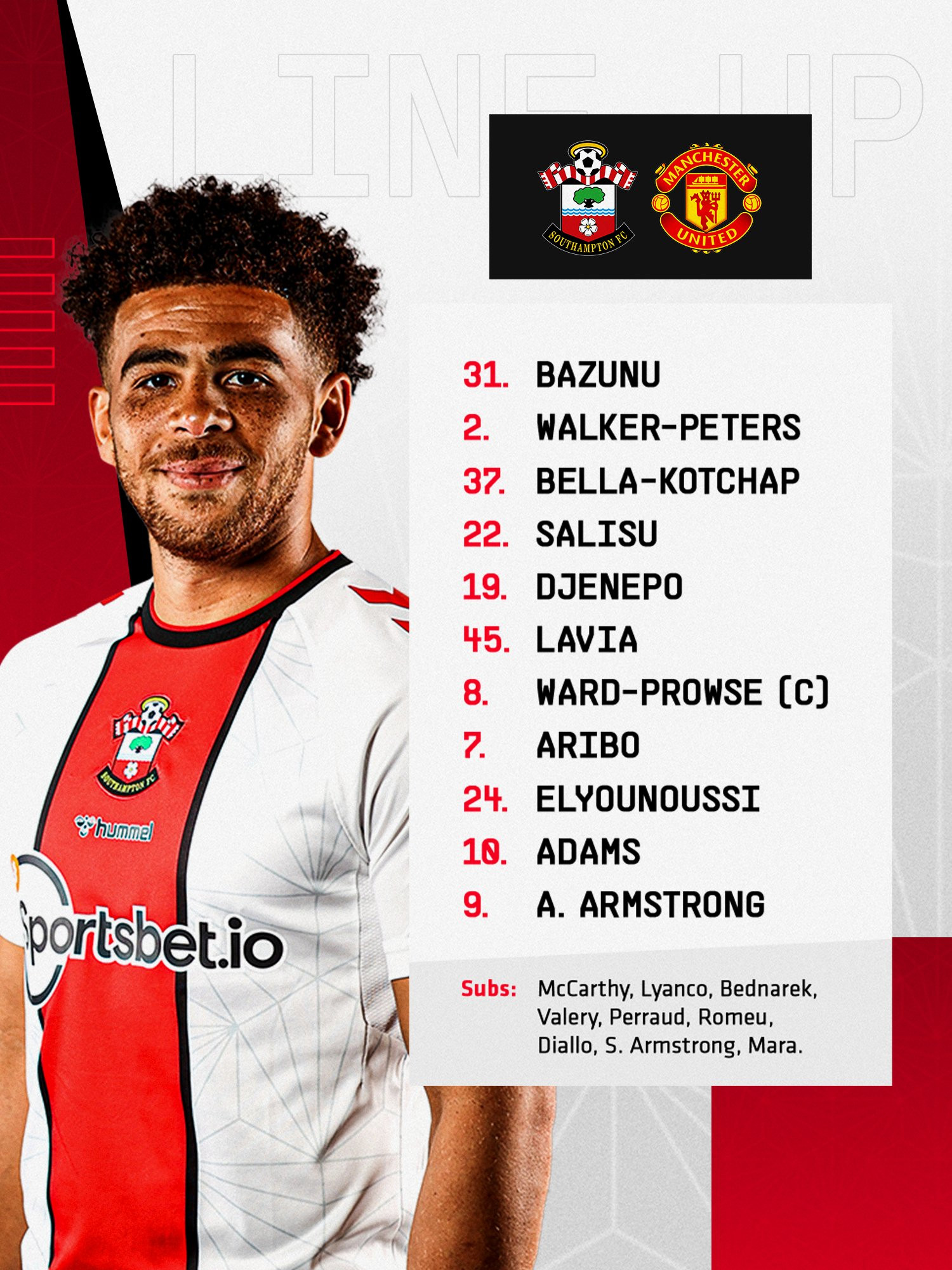 Southampton: Bazunu; Walker-Peters, Bella-Kotchap, Salisu, Djenepo; Ward-Prowse, Lavia; Aribo, Elyounoussi, A.Armstrong; Adams.