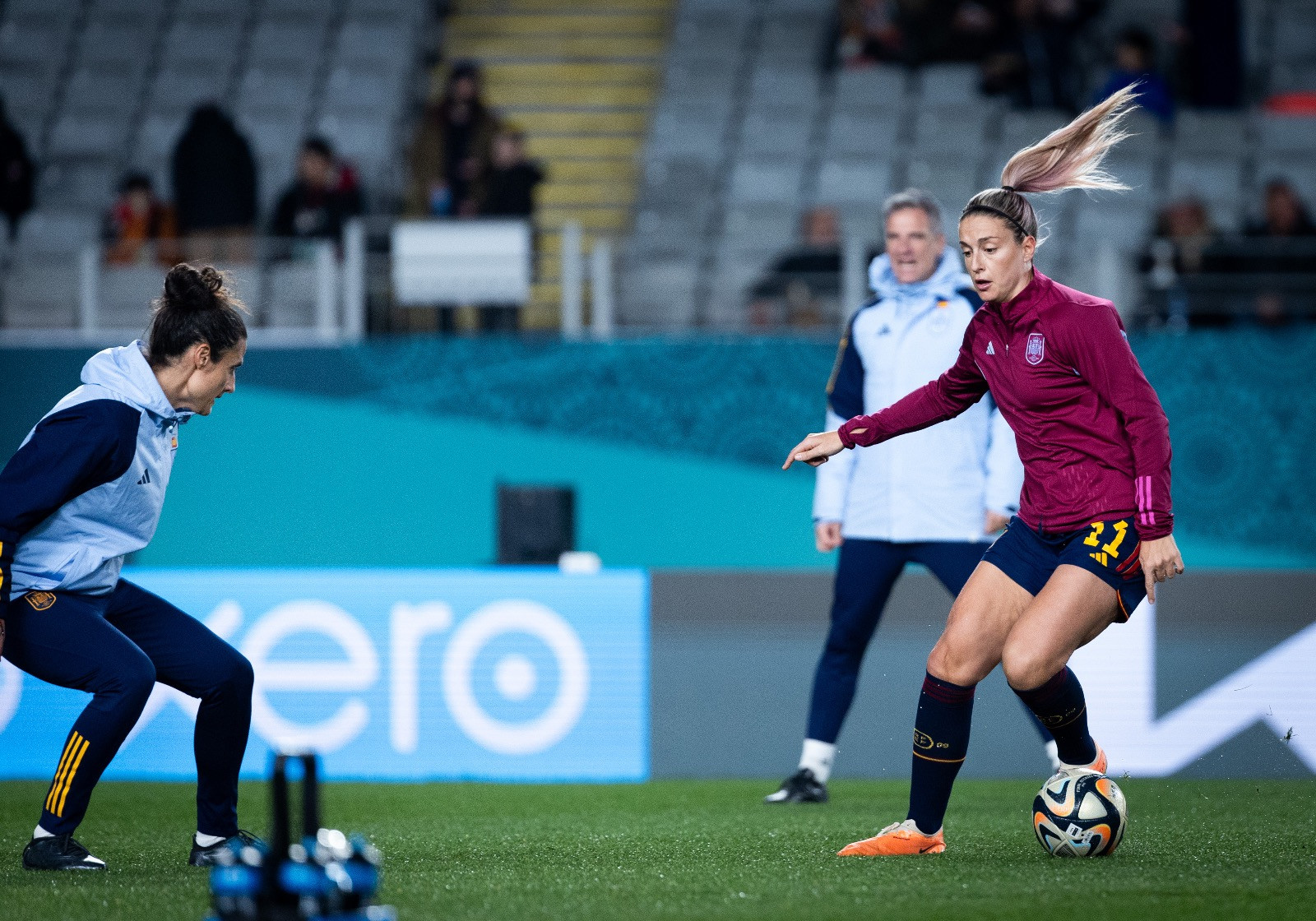 Nữ Tây Ban Nha dần thi đấu gắn kết hơn với những pha phối hợp ở đoạn ngắn. Olga vừa bất ngờ nã pháo tầm xa đưa bóng bay sạt cột dọc.