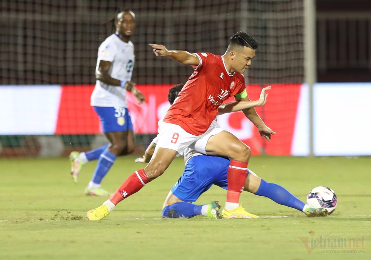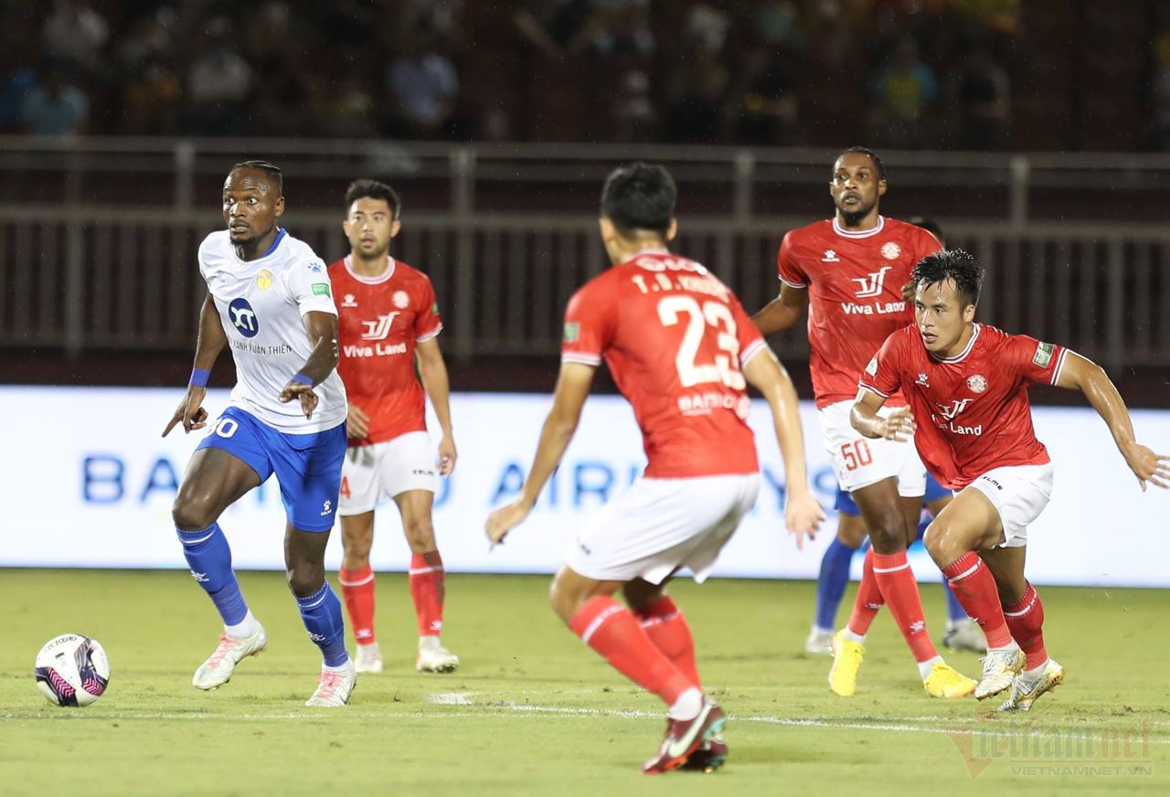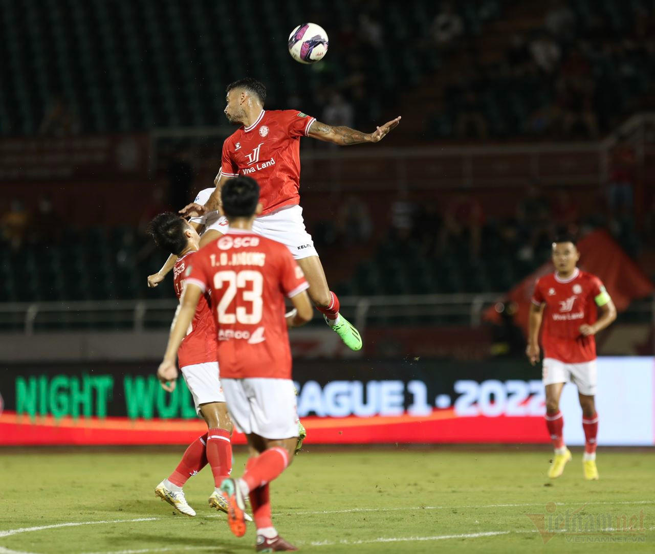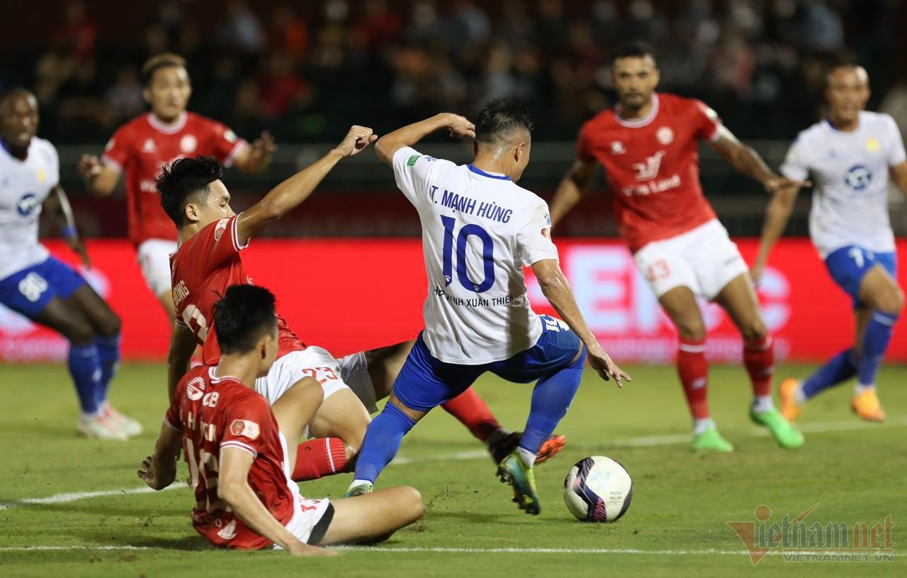 Mải mê tấn công suýt chút nữa TPHCM phải nhận bàn thua thứ hai khi Rodrygo bên phía Nam Định bật cao đánh đầu trong vòng cấm buộc thủ môn Tiến Dũng phải trổ tài.