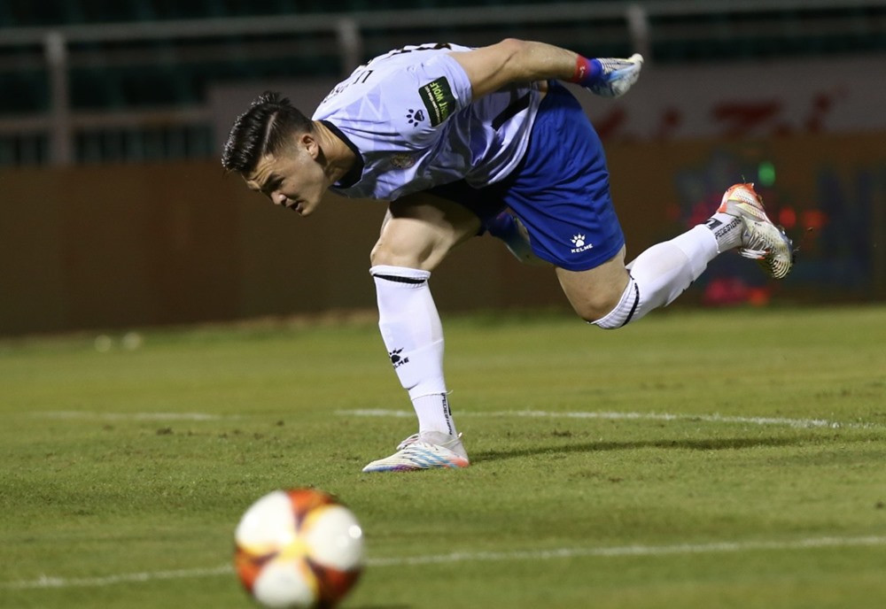 Thủ thành Lê Giang tiếp tục bay người cản phá cú sút của cầu thủ bên phía Đà Nẵng.