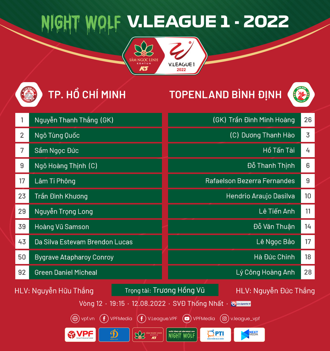 TP.HCM: Thanh Thắng, Tùng Quốc, Ngọc Đức (Văn Đức 66'), Hoàng Thịnh, Ti Phông, Đình Khương, Trọng Long, Hoàng Vũ Samson (Lee Nguyễn 66'), Lucas, Conroy, Green.
