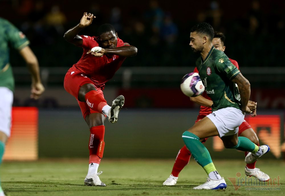Cơ hội dành cho TPHCM nhưng hai cú sút liên tiếp của Hoàng Vũ Samson không đánh bại hậu vệ lẫn thủ môn của Hải Phòng.