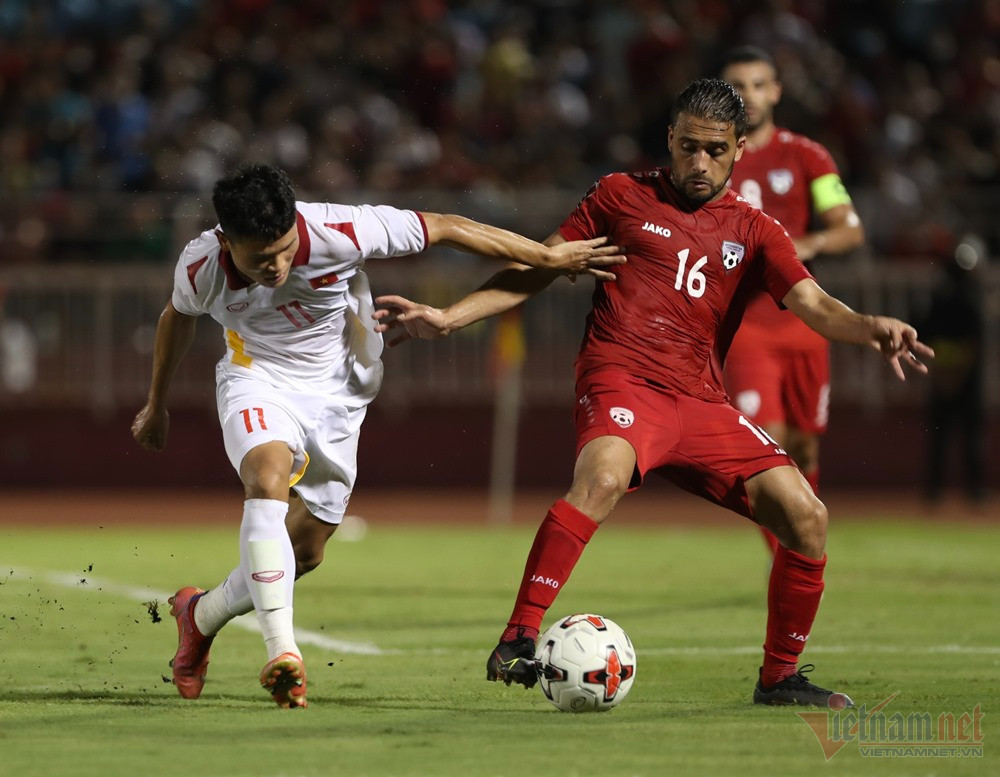 Quang Hải treo bóng vào vòng cấm Afghanistan, Schmidt thoát xuống nỗ lực dứt điểm nhưng sự áp sát của hậu vệ áo đỏ khiến pha kết thúc của cầu thủ Việt kiều không đi trúng khung thành.
