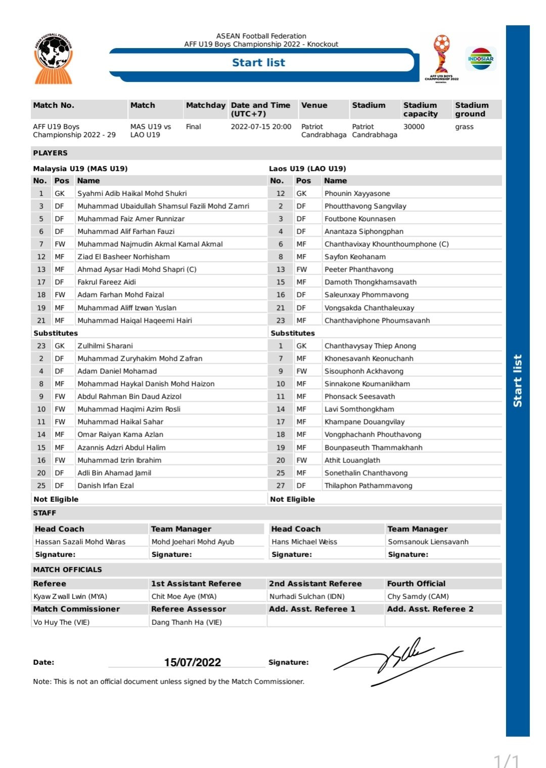 U19 Malaysia: Shukri, Zamri, Runnizar, Fauzi, Akmal, Norshiham, Shapri, Aidil, Faizal, Yuslan, Hairi.