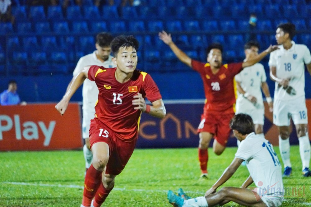 Xuất phát từ pha tấn công bên cánh phải, đội trưởng Văn Trường không thể chạm bóng từ quả tạt chìm của đồng đội, song Đình Bắc lập tức ập vào sút bóng cận thành tung lưới U19 Thái Lan.