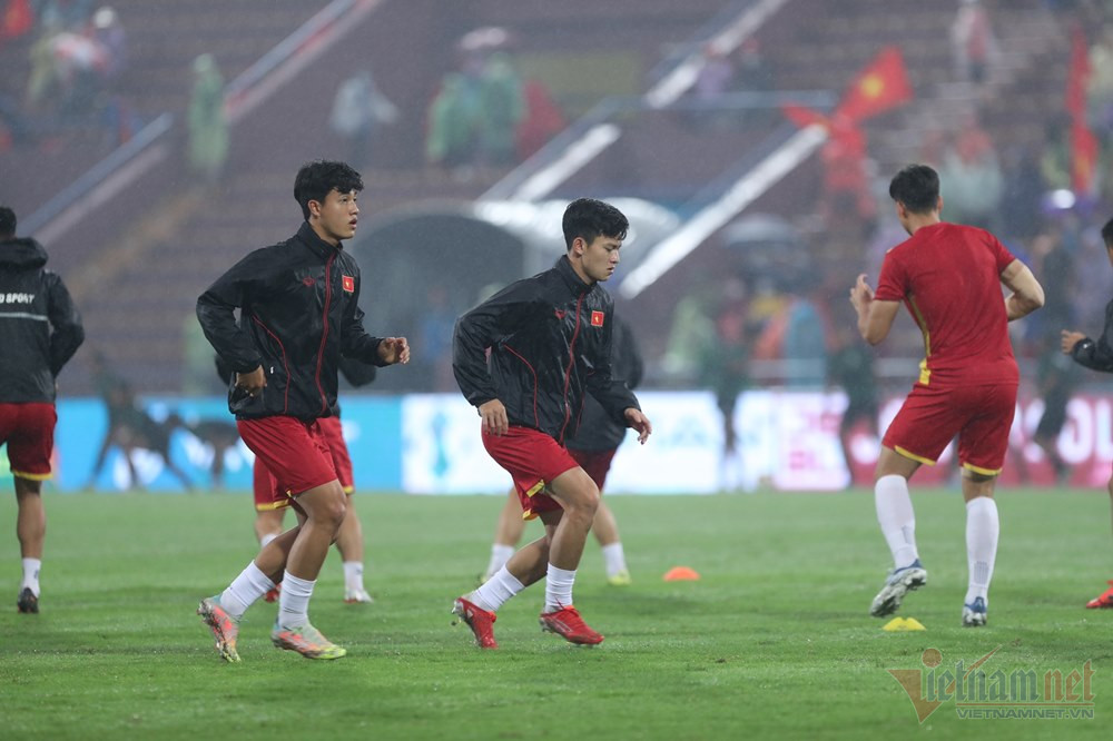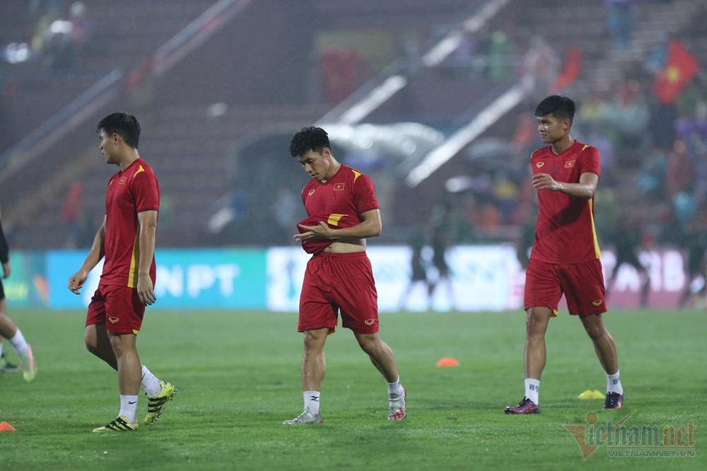 Sân Việt Trì, Phú Thọ đang có mưa, các cầu thủ hai ra sân khởi động trước trận đấu.