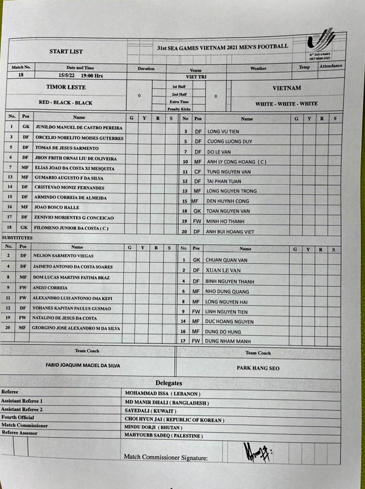 Bóng được đưa vào lưới của thủ môn Văn Toản, tuy nhiên trọng tài biên đã căng cờ báo việt vị đối với cầu thủ U23 Timor Leste.