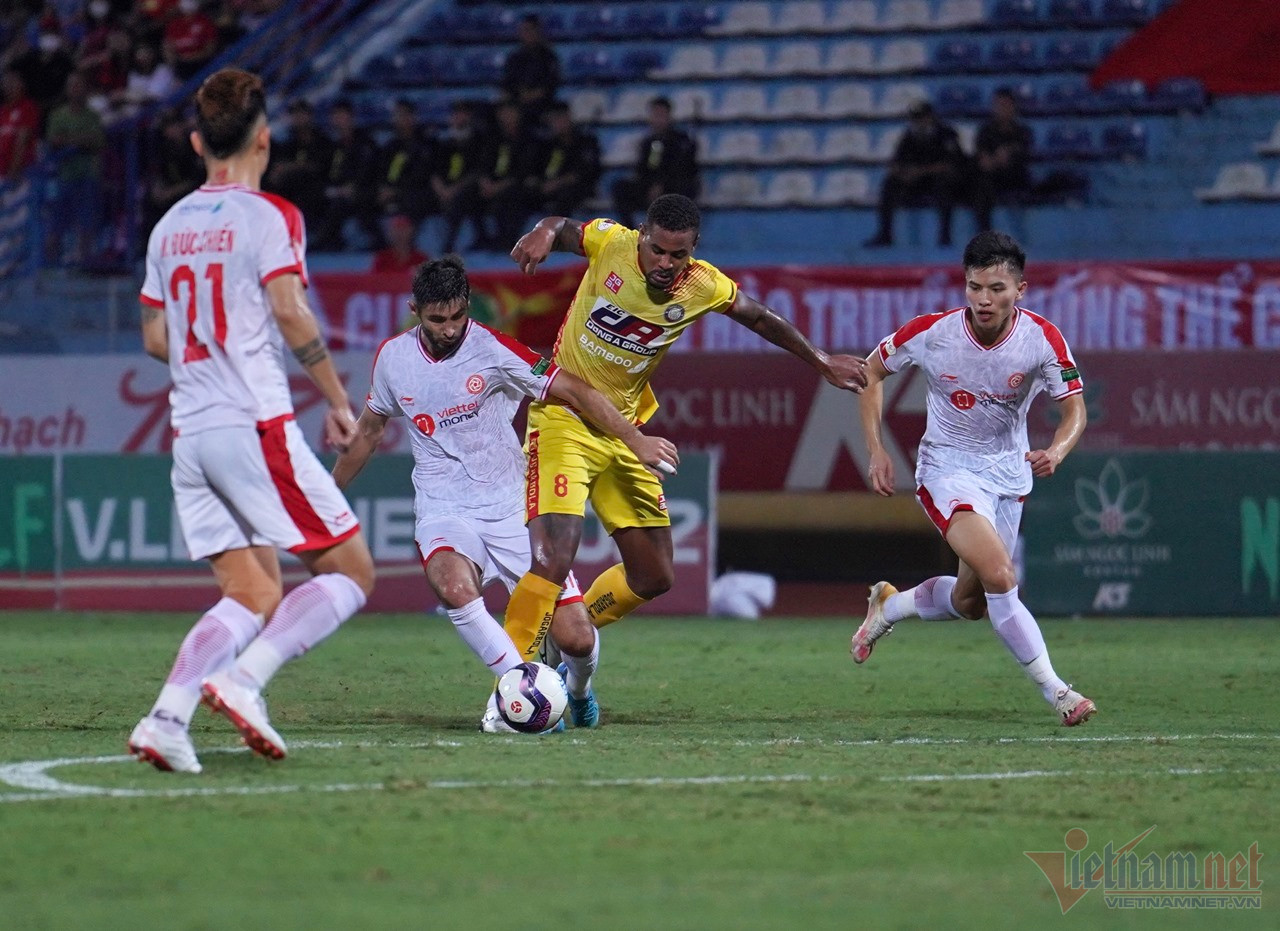 Gustavo Santos tì đè tốt trước sự đeo bám của hai hậu vệ Viettel trước khi dứt điểm đưa bóng đi sát cột dọc đội chủ nhà.