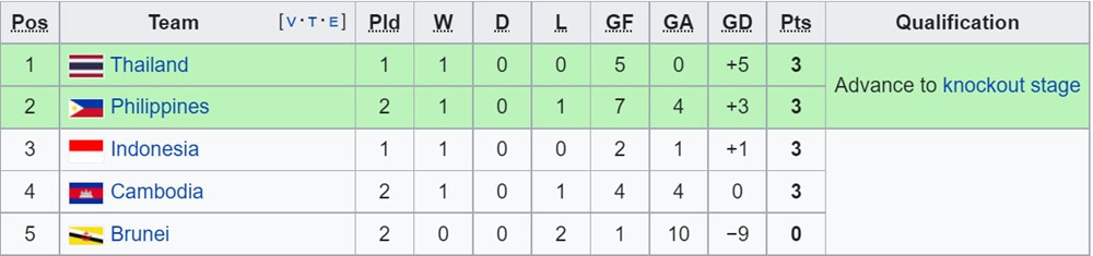 Bảng xếp hạng AFF Cup 2022 - Bảng A
