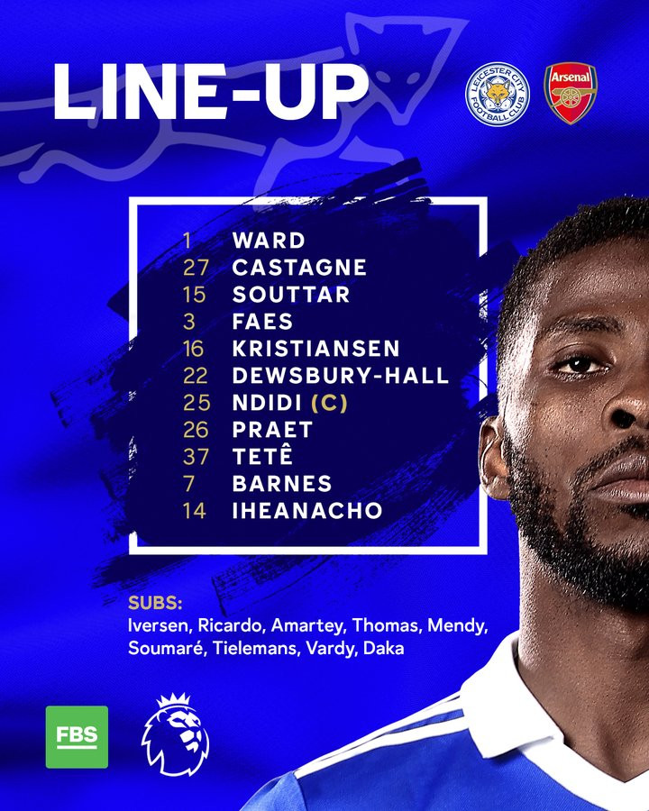 Leicester: Ward, Castagne, Souttar, Faes, Kristiansen, Ndidi, Praet, Tete, Dewsbury Hall, Barnes, Iheanacho.