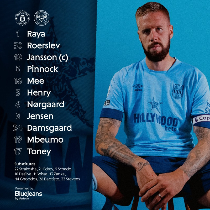 Brentford: Raya; Mee, Pinnock, Jansson; Roerslev, Jensen, Norgaard, Henry; Damsgaard, Mbeumo, Toney.