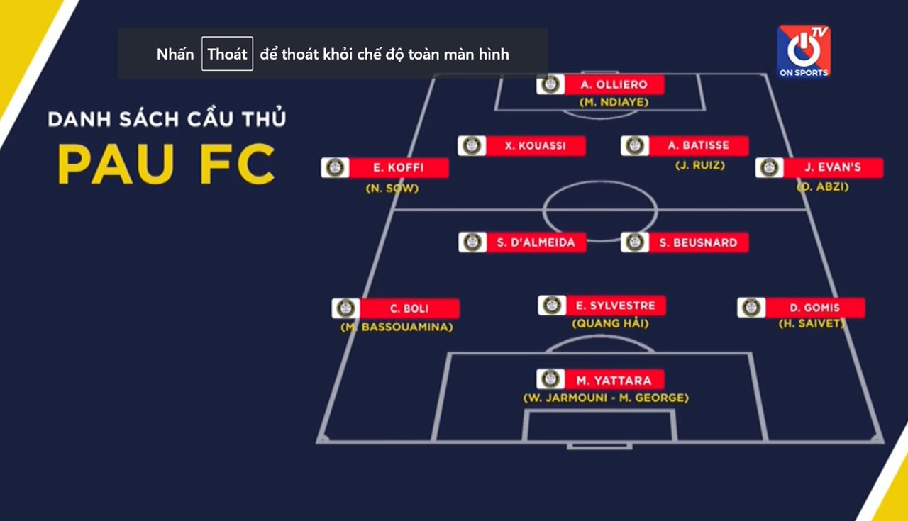 Pau (4-2-3-1): Olliero; Koffi, Kouassi, Batisse, Lambert; Beusnard, Sylvestre; Boli, D'Almeida (Quang Hải 63'), Gomis; Yattara.