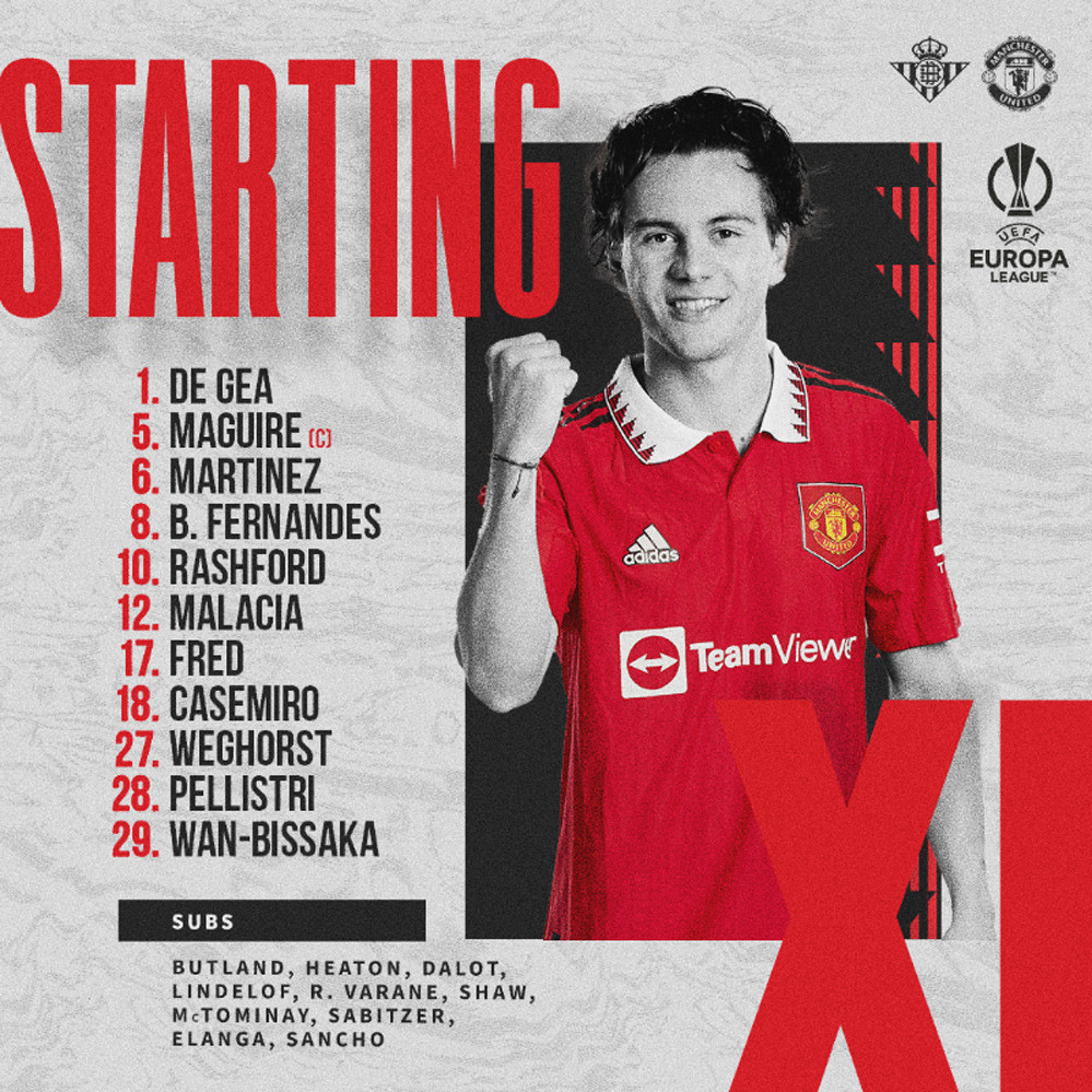 MU: De Gea, Wan-Bissaka, Maguire, Lisandro Martinez, Malacia, Casemiro, Fred, Pellistri, Fernandes, Rashford, Weghorst.