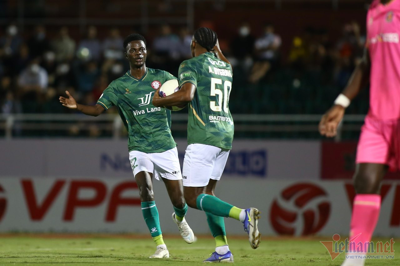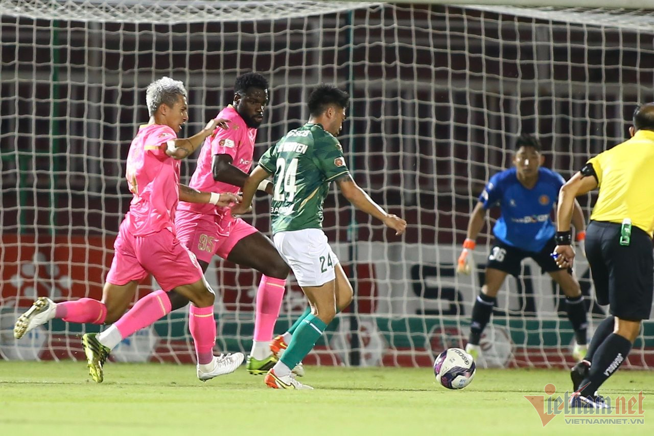 Nicolas Olsen chớp cơ hội từ sự phối hợp thiếu ăn ý giữa thủ môn Thanh Thắng và Sầm Ngọc Đức để dứt điểm mở tỷ số cho Sài Gòn.
