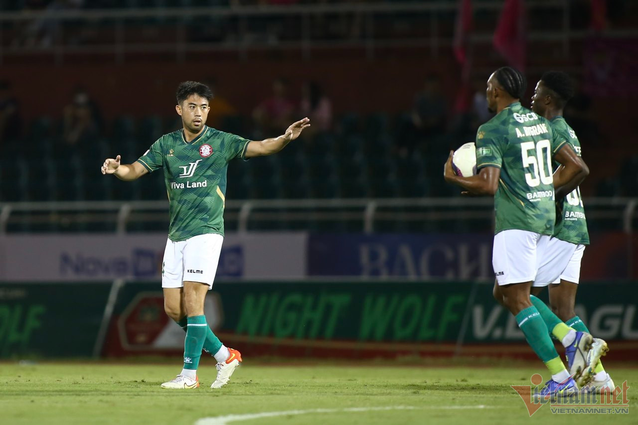Lee Nguyễn treo bóng từ tình huống cố định để tiền đạo mới vào sân thay người Hoàng Vũ Samson bật cao đánh đầu tung lưới Sài Gòn.