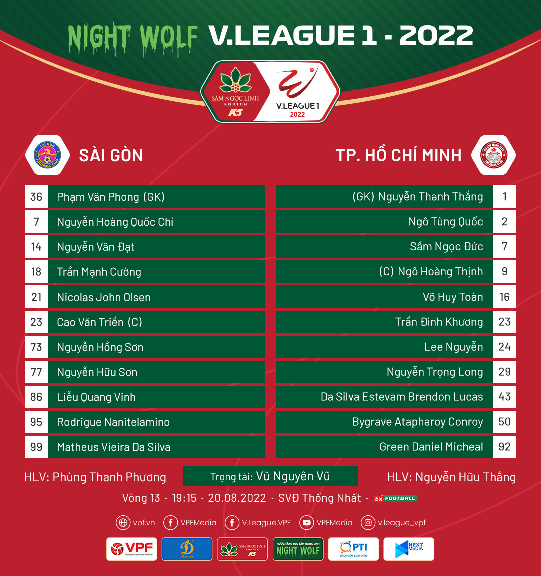 TP.HCM: Thanh Thắng, Tùng Quốc, Đình Khương, Brendon, Ngọc Đức, Huy Toàn (Samson, 68’), Hoàng Thịnh, Lee Nguyễn, Trọng Long (Quốc Gia, 87’), Bygrave, Green.