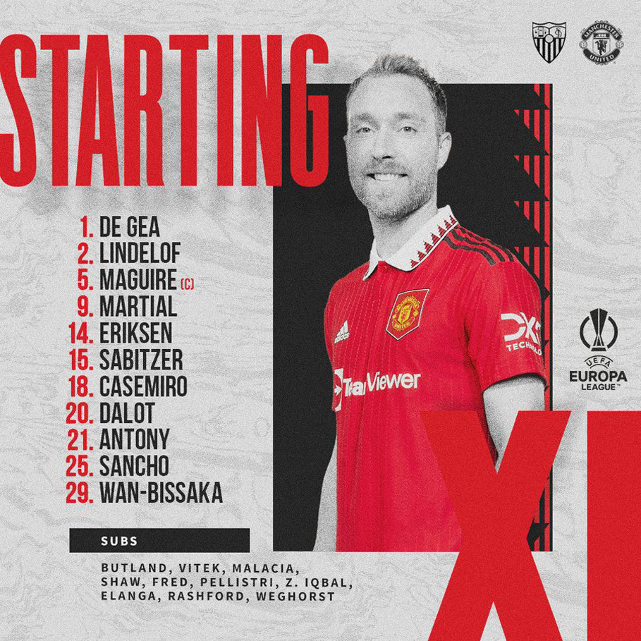 MU: De Gea; Wan-Bissaka (Shaw 46'), Maguire, Lindelof, Dalot; Casemiro, Sabitzer, Eriksen; Antony, Martial, Sancho (Rashford 46').