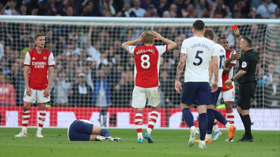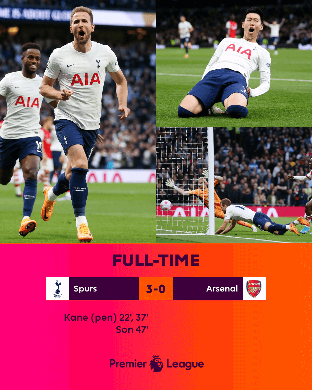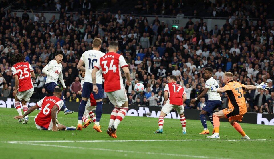 Phút 22, Tottenham được hưởng penalty khi Soares phạm lỗi với Son Heung-min trong vòng cấmHarry Kane dứt điểm chính xác mở tỷ số trên chấm 11mThảm họa ập đến với đội khách, Holding nhận thẻ vàng thứ hai rời sân từ phút 33The Gunners chỉ còn chơi với 10 người từ cuối hiệp mộtPhút 37, từ tình huống phạt góc, Harry Kane đánh đầu nối cận thành nhân đôi cách biệtHLV Arteta tức giận bên ngoài đường biênNgay đầu hiệp hai, Son Heung-min chớp thời cơ nhanh nâng tỷ số lên 3-0Niềm vui của Son Heung-minTrái ngược là nỗi thất vọng của các Pháo thủTottenham giành chiến thắng xứng đángTottenham áp sát Arsenal trên BXH, với chỉ một điểm kém hơn trong khi mùa giải còn 2 vòng nữa là hạ màn