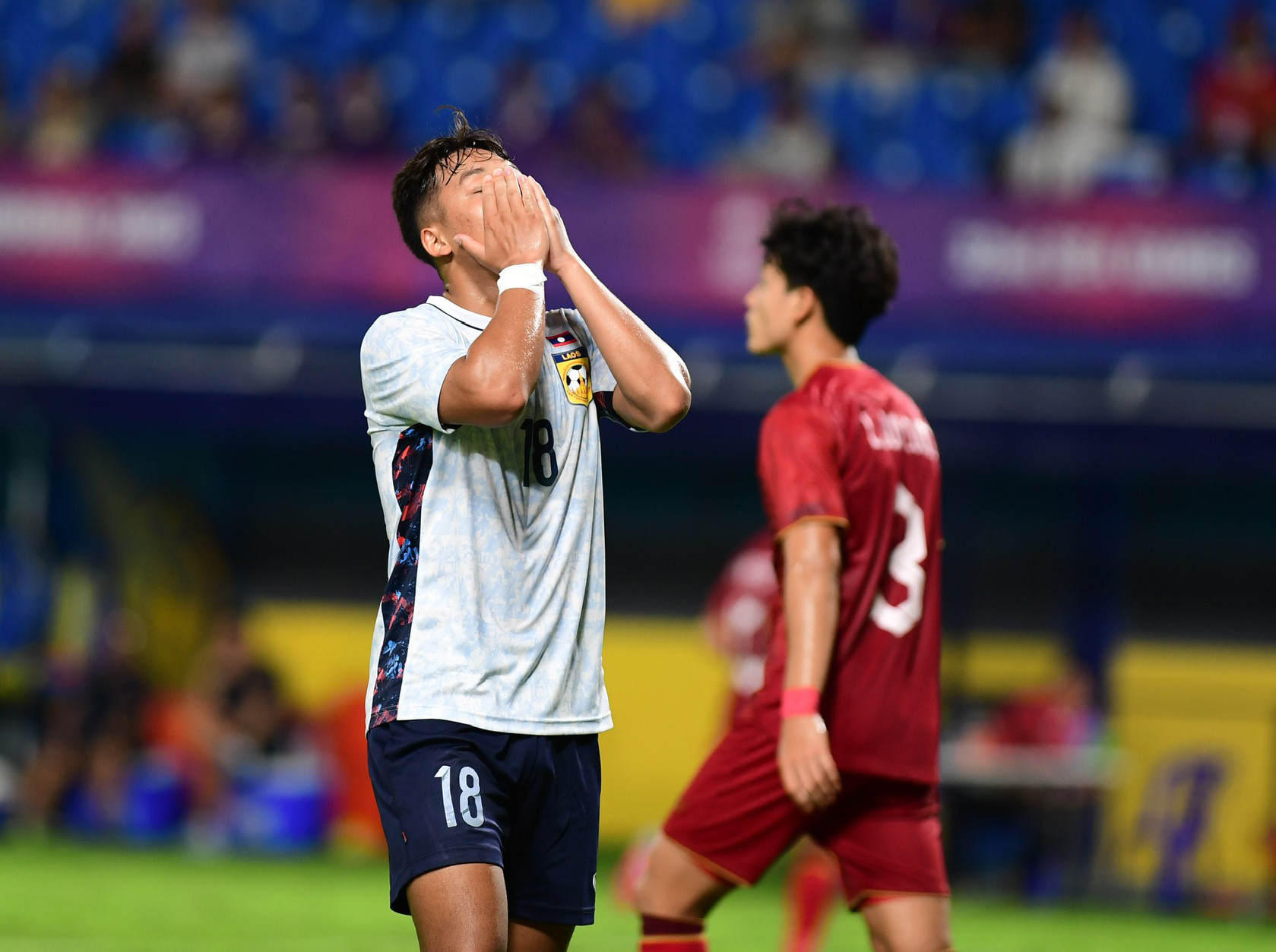 Sau quả tạt từ cánh phải vào của cầu thủ áo đỏ, hậu vệ U22 Lào phá bóng không tốt. Thanh Nhan chớp cơ hội vung chân bắt vô-lê trên vạch 16m50 nhưng thủ môn Solasak Thilavong vẫn làm chủ tình hình.