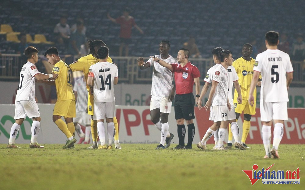 Sân Vinh: Hải Huy nổi nóng với Olaha sau khi ngoại binh của SLNA có pha vào bóng nguy hiểm từ phía sau với thủ quân Hải Phòng. Trọng tài Hoàng Ngọc Hà lập tức rút thẻ vàng cảnh cáo tiền đạo của đội chủ sân Vinh.