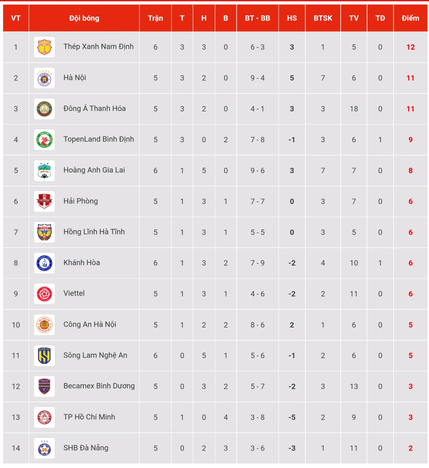 | 12 | SHB Đà Nẵng | 6 | 0 | 3 | 3 | 3 - 6 | -3 | 1 | 11 | 0 | 3 |