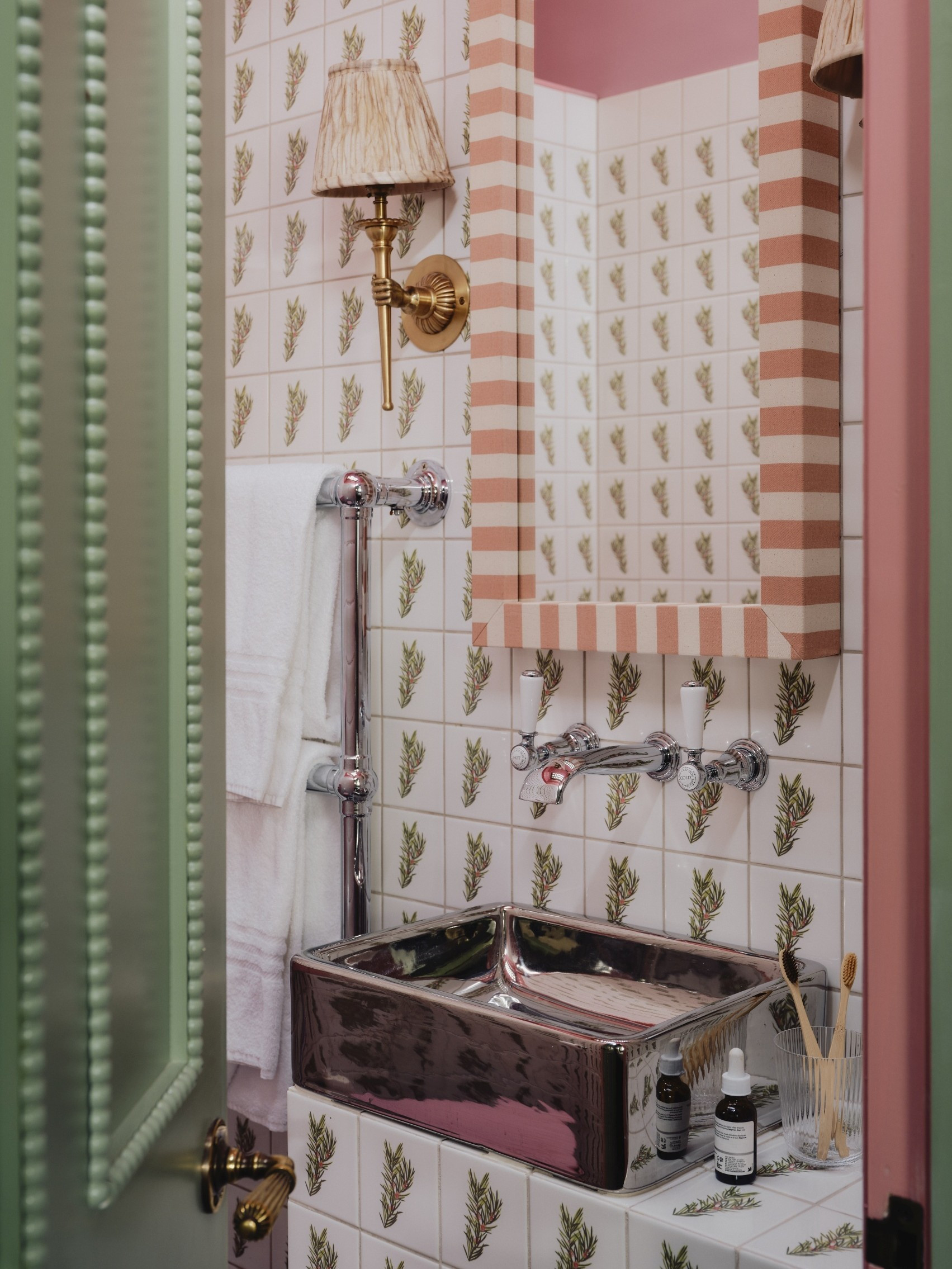 Phòng tắm được lát gạch họa tiết, vòi sen kiểu mưa và các bồn rửa tay thủ công tạo cảm giác vừa cổ điển, vừa tinh tế. Toàn bộ không gian được tinh chỉnh để đảm bảo riêng tư tuyệt đối.