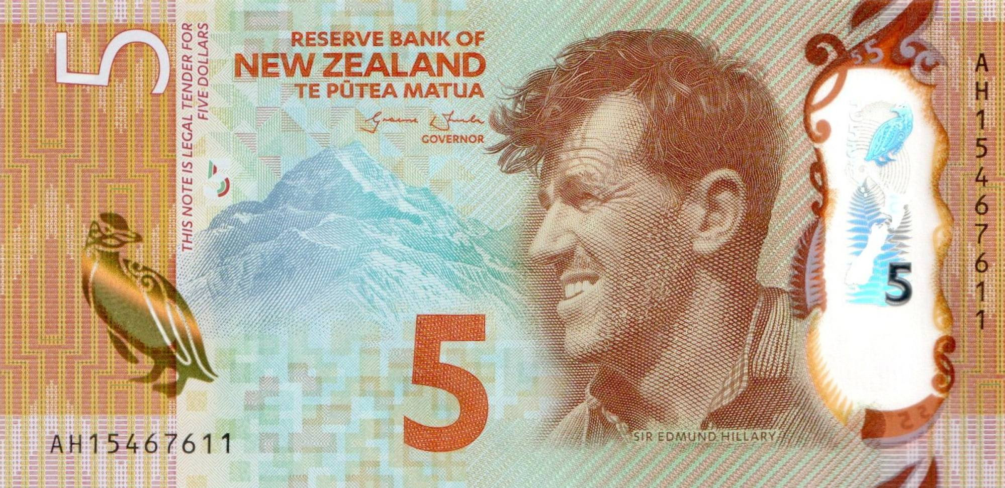 Giữ nguyên hình ảnh những đỉnh núi phủ tuyết trắng, tờ 5 đô la New Zealand in hình nhà thám hiểm xứ Kiwi Edmund Hillary, người đầu tiên leo lên đỉnh Everest, nheo mắt nhìn về phía Aoraki Mount Cook, đỉnh núi cao nhất ở đất nước ông sinh ra.