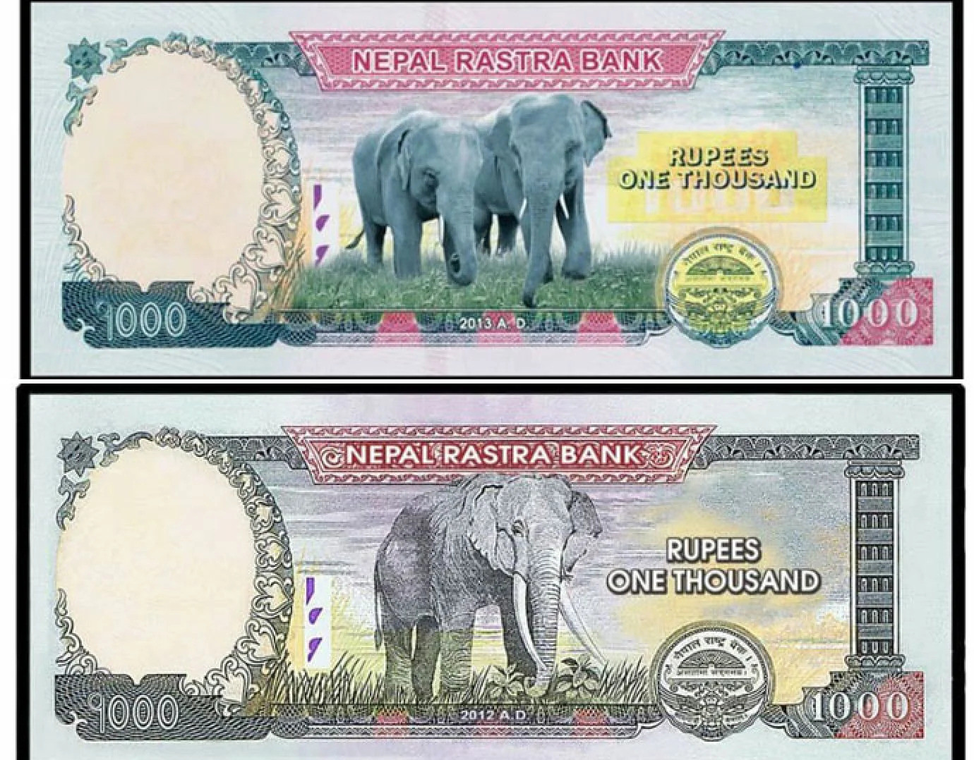 Phiên bản năm 2020 của tờ 1.000 rupee in hình cặp voi song sinh châu Á Ram và Lakshman, sinh ra ở Công viên quốc gia Chitwan.