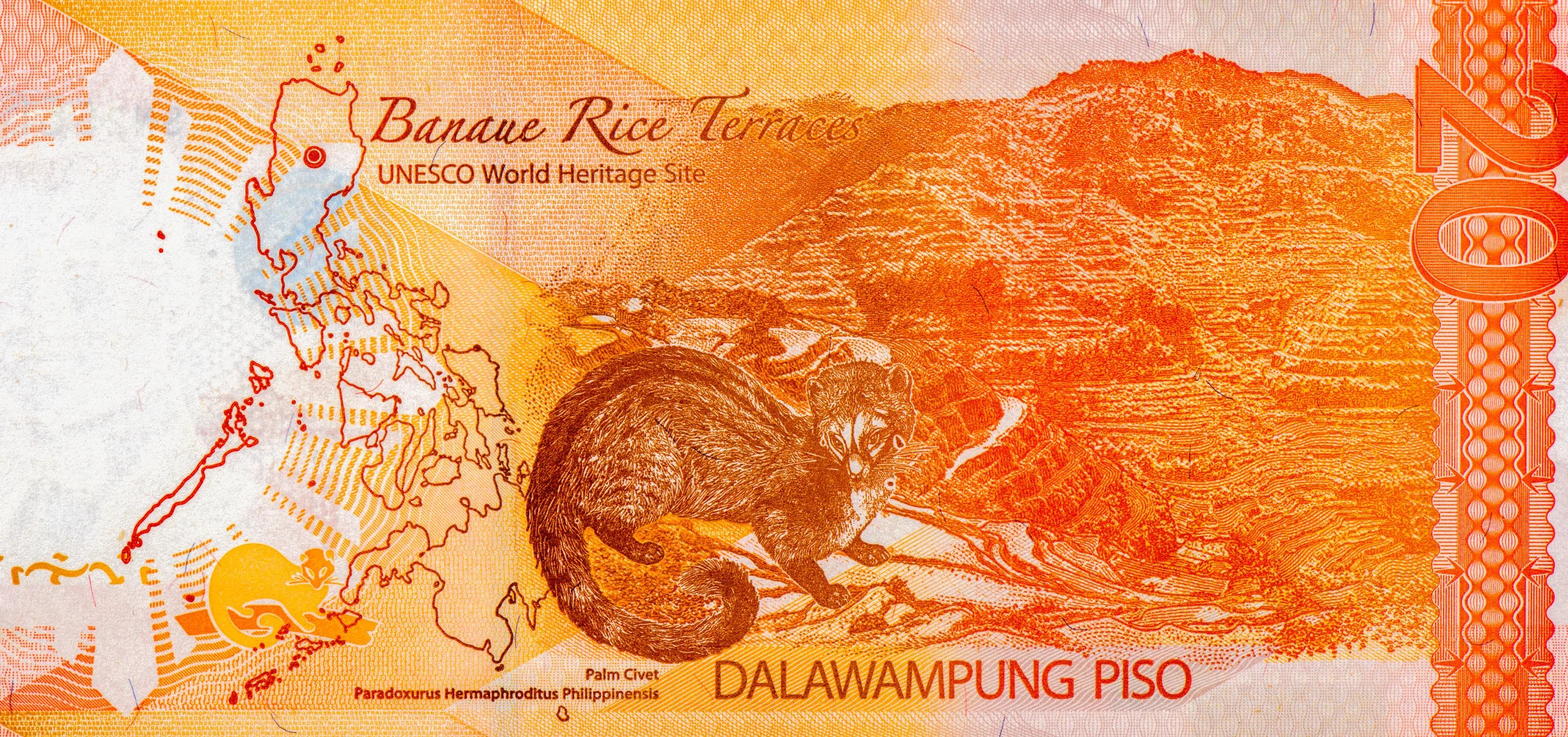 Tờ tiền 20 peso của Philippines in hình ruộng bậc thang Banaue, được tạc vào vùng núi của tỉnh Ifugao khoảng 2.000 năm trước.
