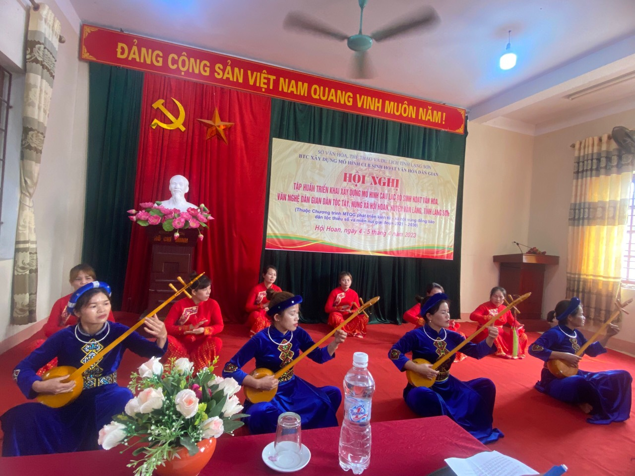 Trước đó, vào tháng 4/2023, tại xã Hội Hoan (huyện Văn Lãng), Sở Văn hóa, Thể thao và Du lịch Lạng Sơn cũng đã phối hợp với UBND huyện Văn Lãng tổ chức hội nghị tập huấn triển khai xây dựng mô hình Câu lạc bộ sinh hoạt văn hóa, văn nghệ dân gian dân tộc Tày, Nùng xã Hội Hoan.