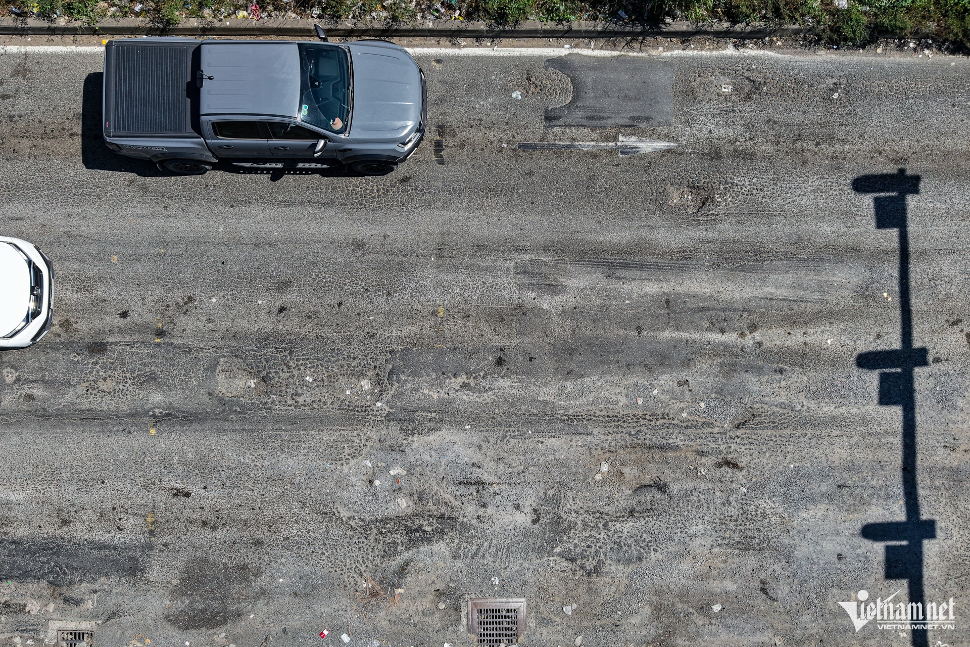 Khoảng 500m mặt đường xuất hiện vệt lún dài cùng nhiều hố lớn nhỏ, nước đọng tạo thành các vũng sâu. Các lớp nhựa bị biến dạng, nhiều xe buộc phải di chuyển chậm hoặc lấn sang làn khác để tránh.