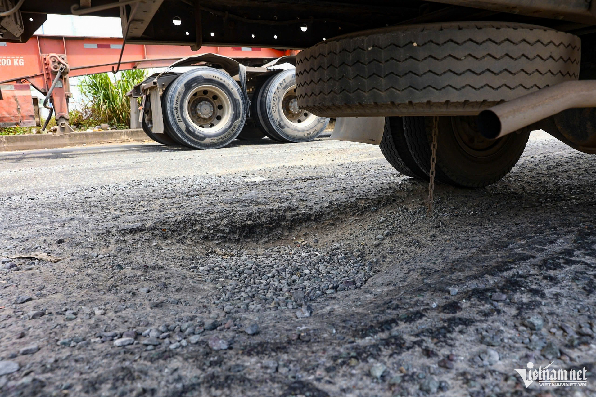 Mặt đường Đồng Văn Cống, đoạn dẫn vào cảng Cát Lái, xuất hiện nhiều ổ gà lớn, có nơi rộng gần 1m, sâu từ 5-10cm.