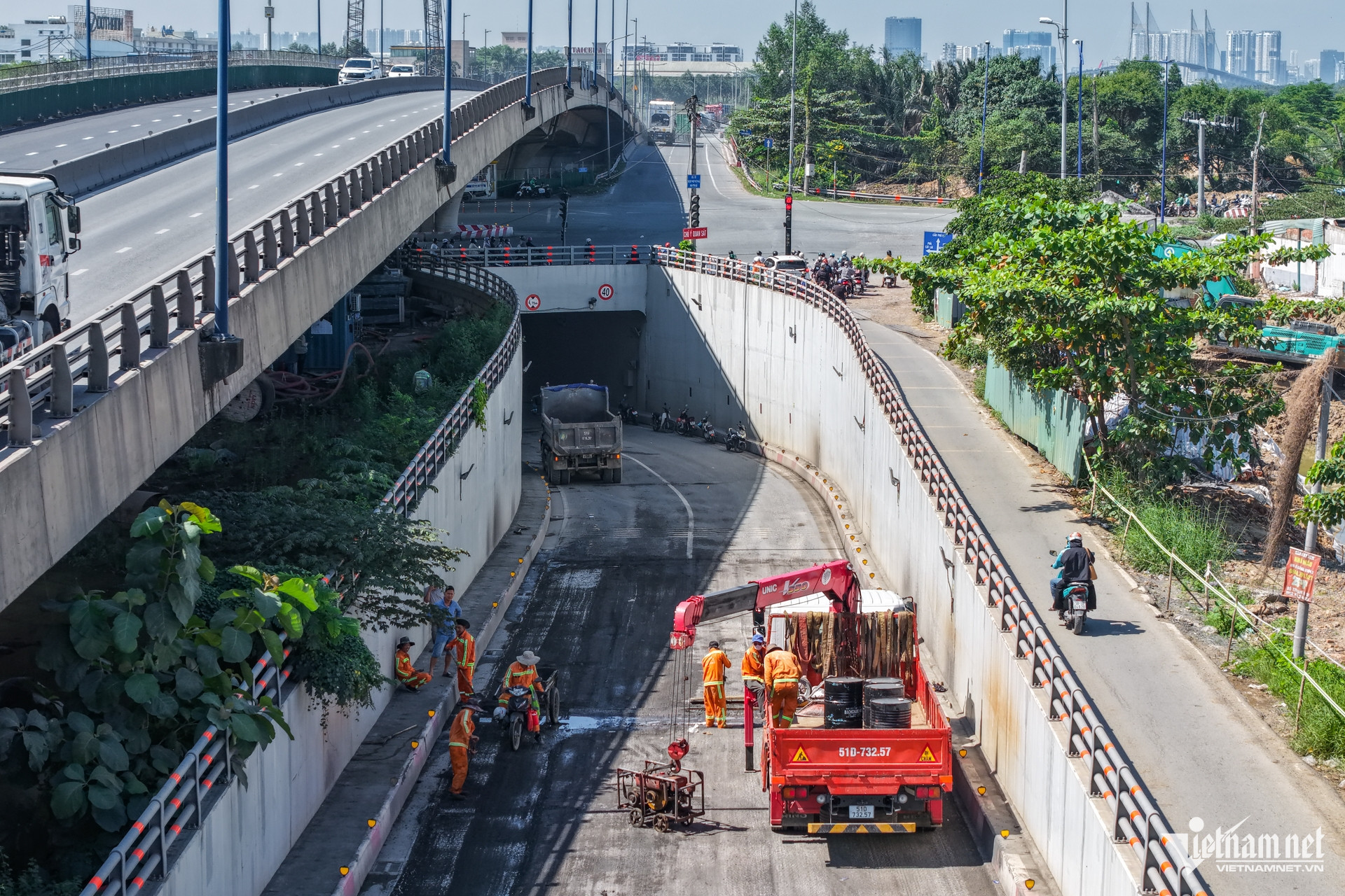 Tại hầm chui Mỹ Thủy - điểm kết nối các tuyến đường lớn như Nguyễn Thị Định, Võ Chí Công, Đồng Văn Cống cũng ghi nhận nhiều vị trí hư hỏng nặng. Công nhân đang khắc phục sự cố, theo ghi nhận sáng 19/10.