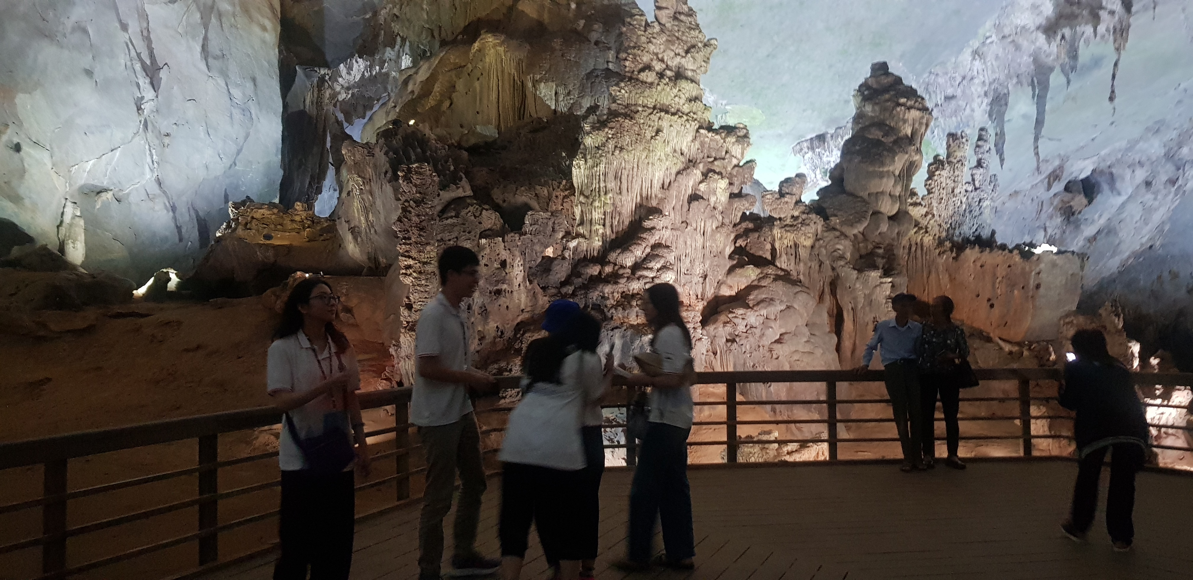 Đoạn đường bộ trong động, giúp du khách có nhiều cơ hội chạm vào thạch nhũ. Các kiều bào trẻ vui vẻ chụp ảnh kỷ niệm tại nơi này.