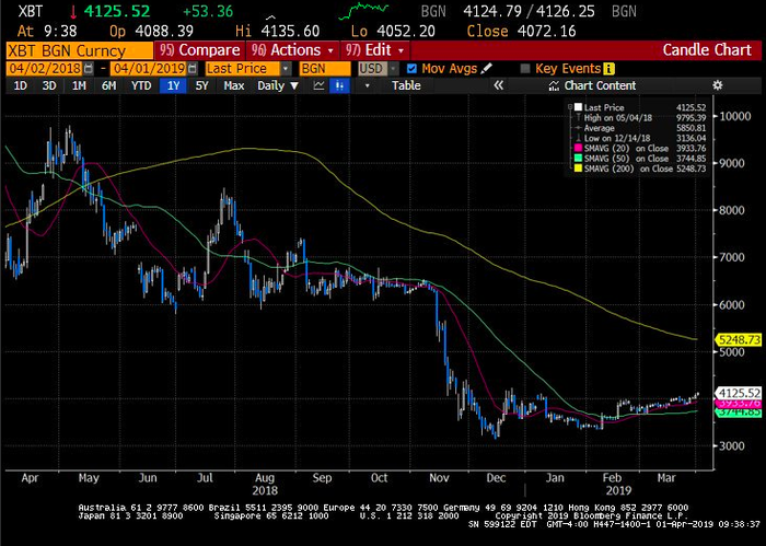 Nến Bitcoin trong tháng 2 mở ở mức 3.434 USD và đóng cửa ở mức 3,823 USD với mức tăng giá 11%. Nến bitcoin trong tháng 3 đã mở ở mức 3.823 USD và đóng cửa ngày hôm qua ở mức 3.942 USD, với mức tăng nhẹ 3%. Bitcoin đã không ghi nhận hai nến xanh hàng tháng liên tiếp kể từ tháng 12 năm 2017, khi Bitcoin thiết lập mức cao kỉ lục 20.000 USD.