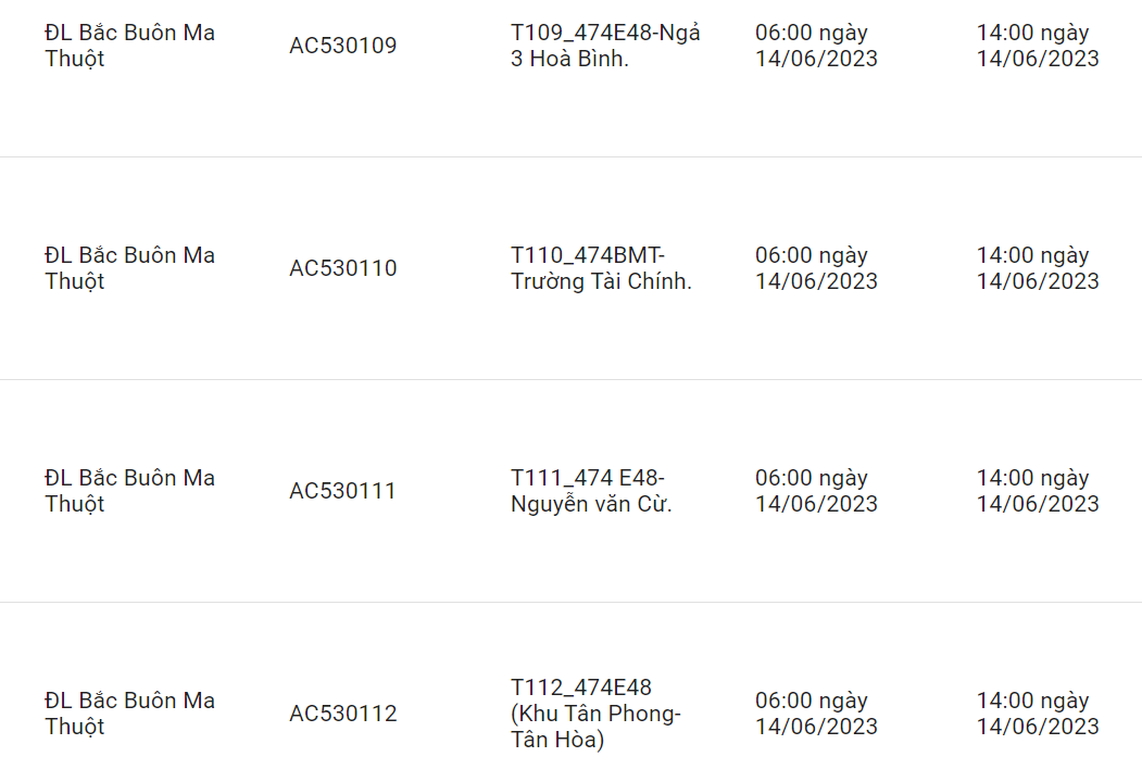 06:00 - 14:00: T109_474E48-ngã 3 Hoà Bình, T110_474BMT-trường Tài Chính, T111_474 E48-Nguyễn Văn Cừ, T112_474E48 (khu Tân Phong -Tân Hòa), T250_474BMT - khu Tân Phong, Tân Hoà, T447_474BMT_Tân Hoà, T548_474BMT - Tân Phong, Tân Hòa, T113_474BMT_trường VH 3 Bộ Công an (trạm KH), T114_474BMT-xí nghiệp XNK 2/9 KM6