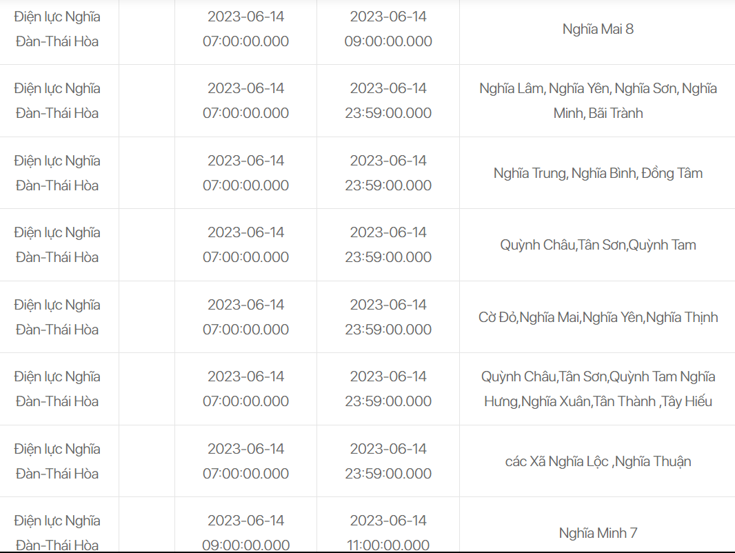 07:00 - 23:59: Nghĩa Lâm, Nghĩa Yên, Nghĩa Sơn, Nghĩa Minh, Bãi Trành, Nghĩa Trung, Nghĩa Bình, Đồng Tâm, Quỳnh Châu, Tân Sơn, Quỳnh Tam, Cờ Đỏ, Nghĩa Mai, Nghĩa Yên, Nghĩa Thịnh, Nghĩa Hưng, Nghĩa Xuân, Tân Thành, Tây Hiếu, Nghĩa Lộc, Nghĩa Thuận