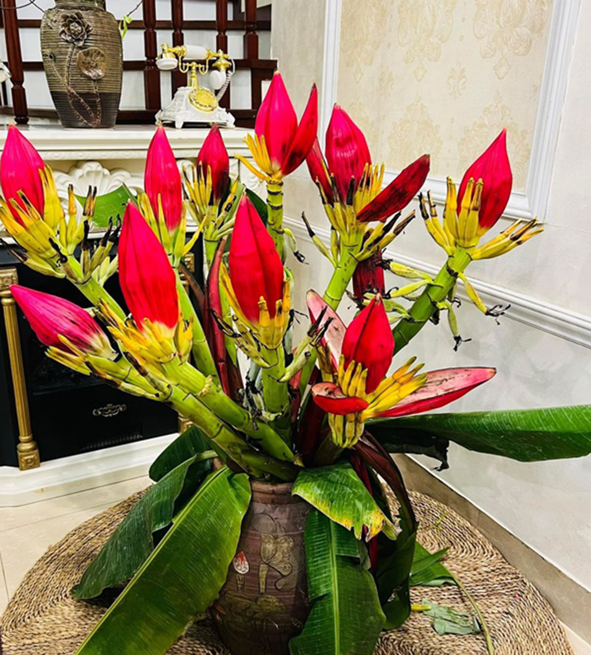 Những bông hoa chuối rừng to hơn bắp chân, xen lẫn cả hoa và quả đủ đầy, tươi lâu mà không cần chăm sóc cầu kỳ rất phù hợp với nhiều chị em bận rộn. Người chơi mua hoa về nên cắm vào những lọ lục bình lớn và đặt để ở những không gian rộng như phòng khách, phòng sinh hoạt chung.