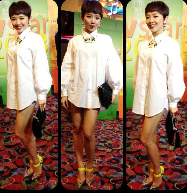 | Kiểu "mặc như không" được sao Việt yêu thích chính là mốt áo trùm kín quần. Tóc Tiên sexy khoe chân thon với mốt "quên mặc quần". Thực chất chiếc sơ mi trắng đã che đi short ngắn bên trong. |