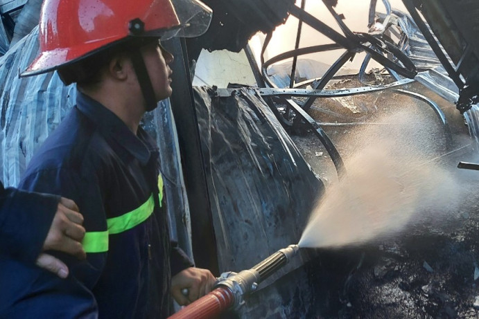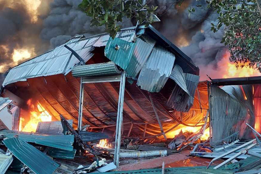 Đến 7h30, lực lượng PCCC gồm hàng chục người vẫn nỗ lực dập tắt đám cháy. Tuy nhiên do đám cháy lớn, toàn bộ khung sắt, mái tôn nhà xưởng bị thiêu rụi, nhiều chỗ bị sập. Hiện tại, ngọn lửa đã được cơ bản khống chế.