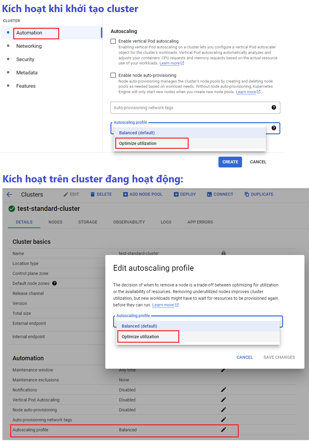 Ngoài ra, theo thống kê trung bình trên toàn bộ hệ thống, Google cũng chỉ ra rằng các cluster của người dùng khi kích hoạt optimize utilization có thể giảm vCPU và RAM xuống 20% so với mức trung bình. Việc này thực hiện đơn giản nhưng mang lại hiệu suất cao, chúng ta có thể kích hoạt nó ngay khi tạo cluster hoặc chỉnh sửa trên chính cluster đang hoạt động như bên dưới.