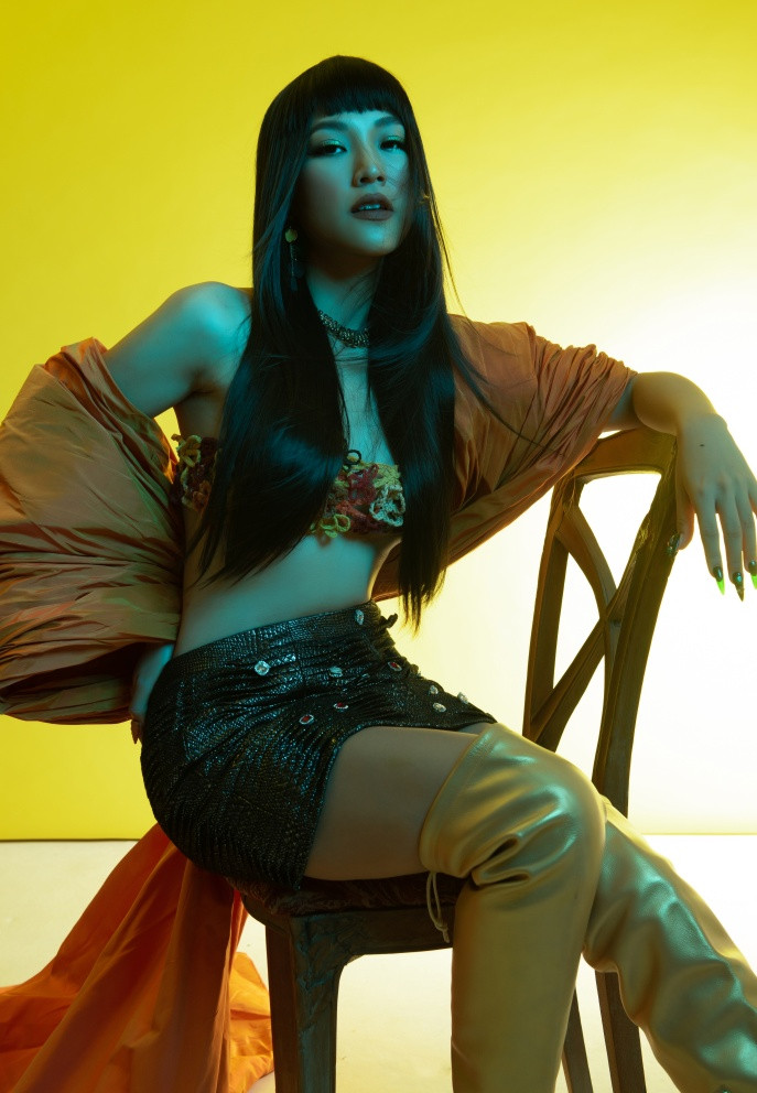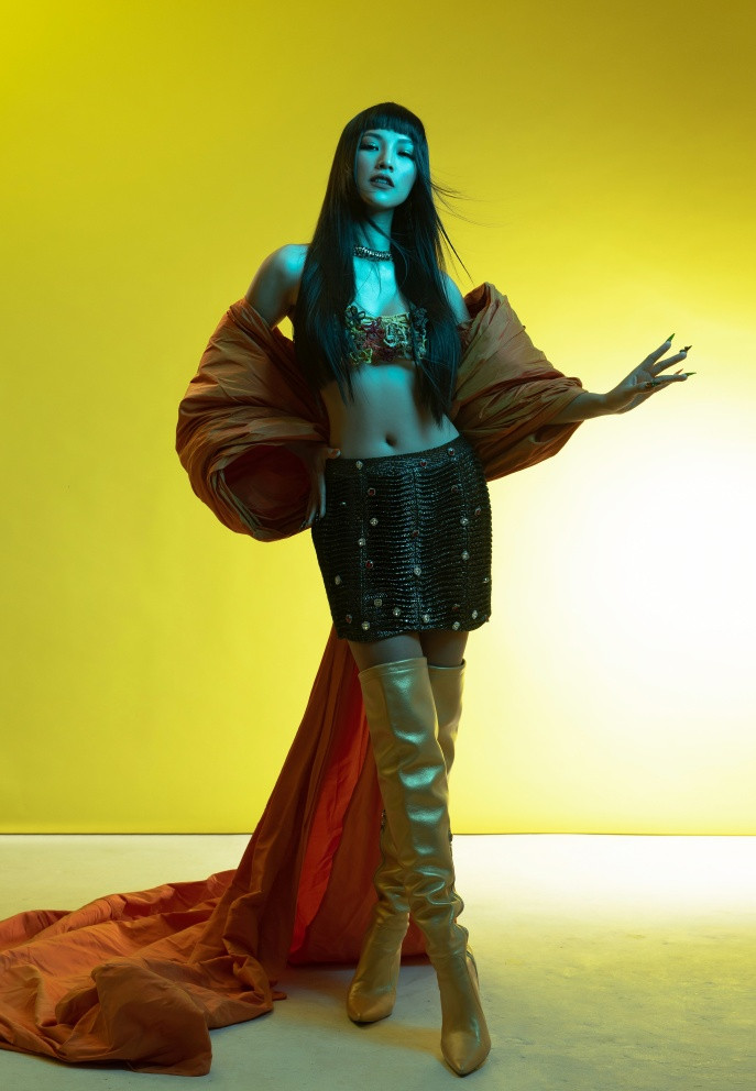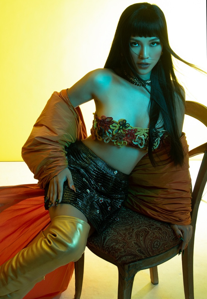 Trong khoảnh khắc khác, MC Hoàng Oanh hóa thân "nàng tiên sa mạc" quyến rũ trong bộ cánh đính cườm lấp lánh sexy. Vòng eo của người đẹp được khoe trọn với chiếc áo crop-top ngắn và mini skirt. Cô để tóc dài thẳng mái bằng cùng đôi boots, thể hiện thần thái lạnh lùng thu hút người đối diện.